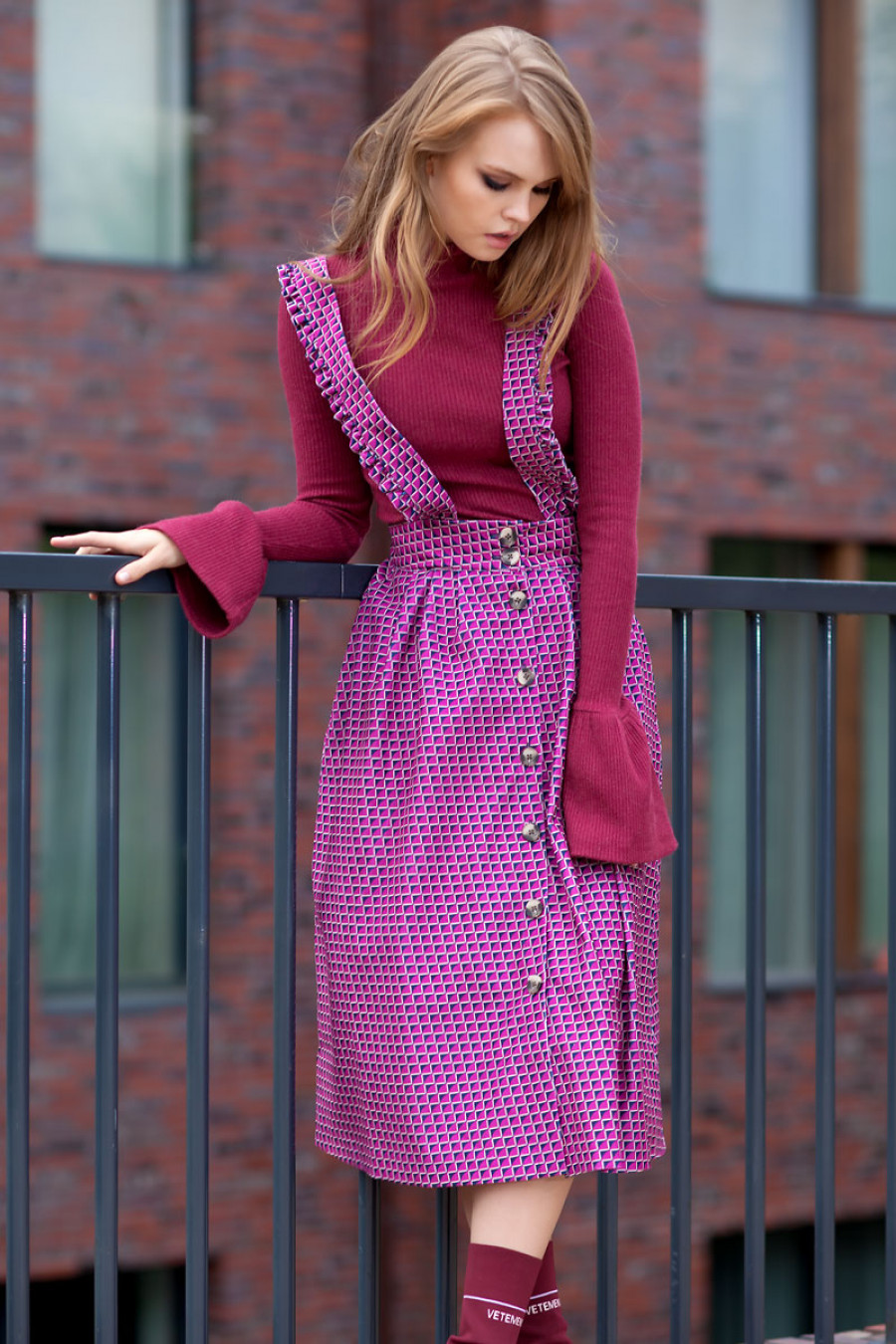 Стильная юбка-сарафан из вельвета с геометрическим принтом. Бретели пристегиваются на пуговицы. Модель силуэта клеш с застежкой впереди на пуговицы.