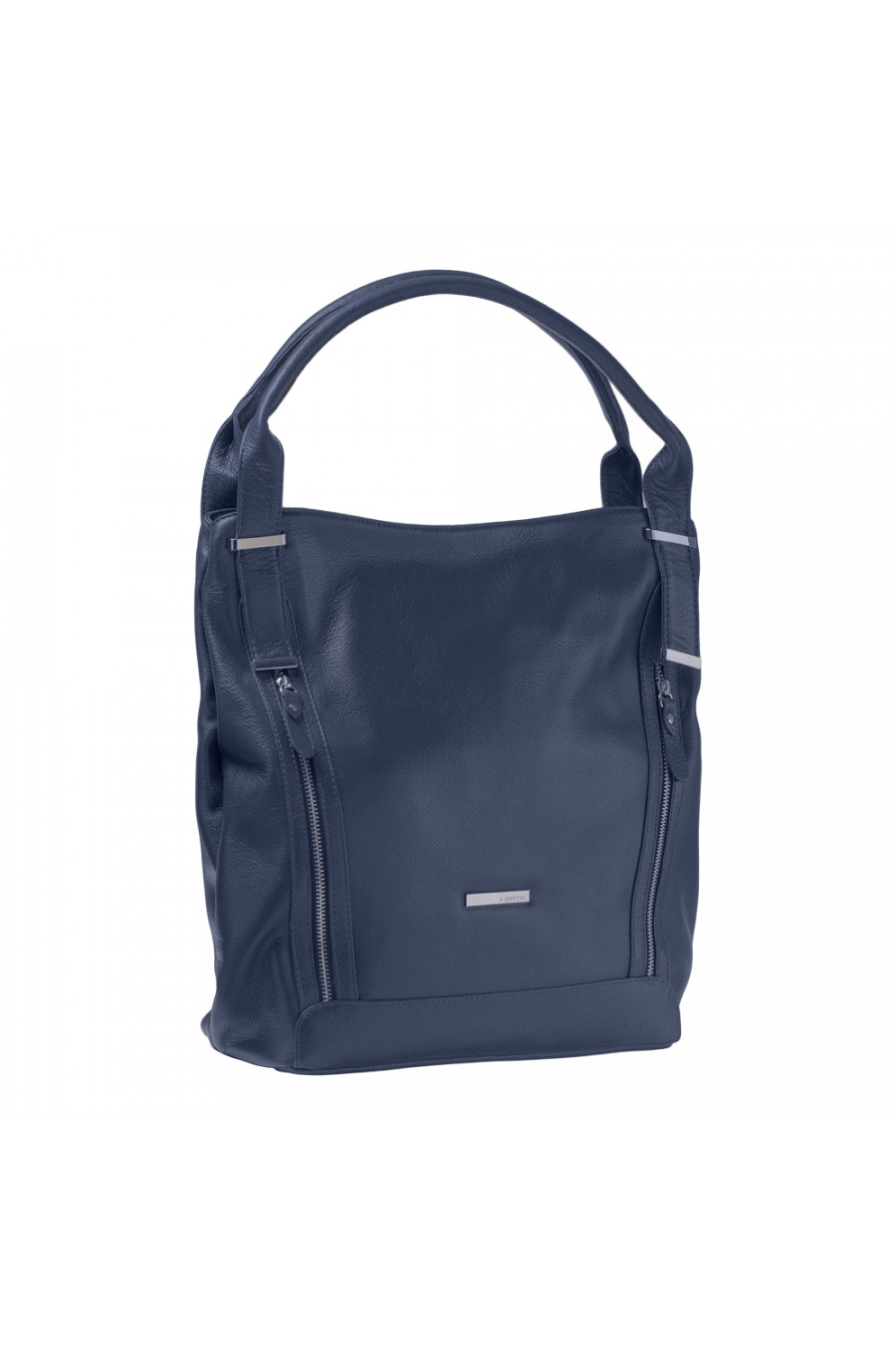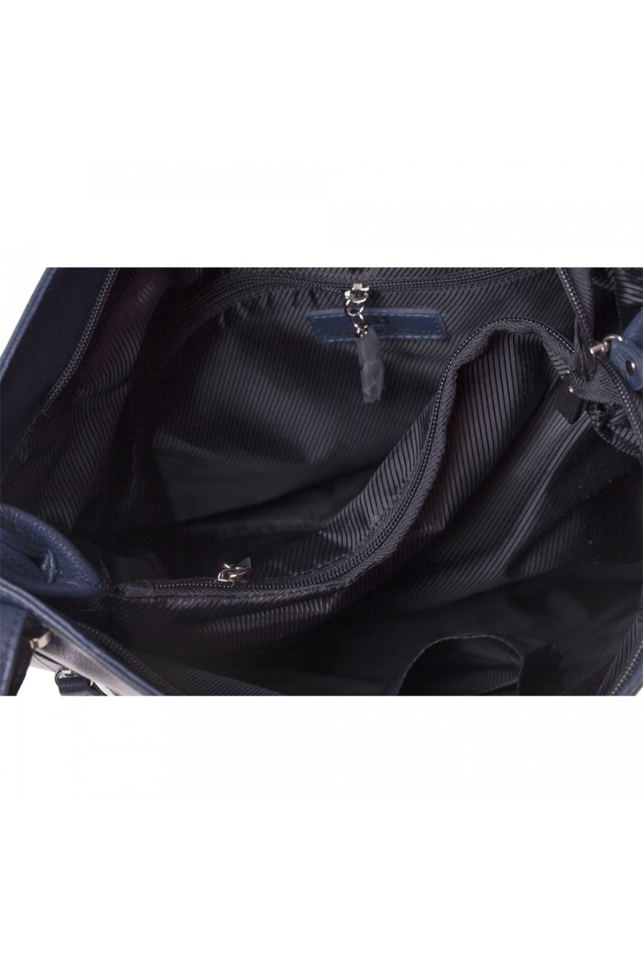 Снаружи: Одно отделение, разделённое перегородкой на молнии.На передней стенке- кармашек для мелочей.На задней стенке- карман на молнии.