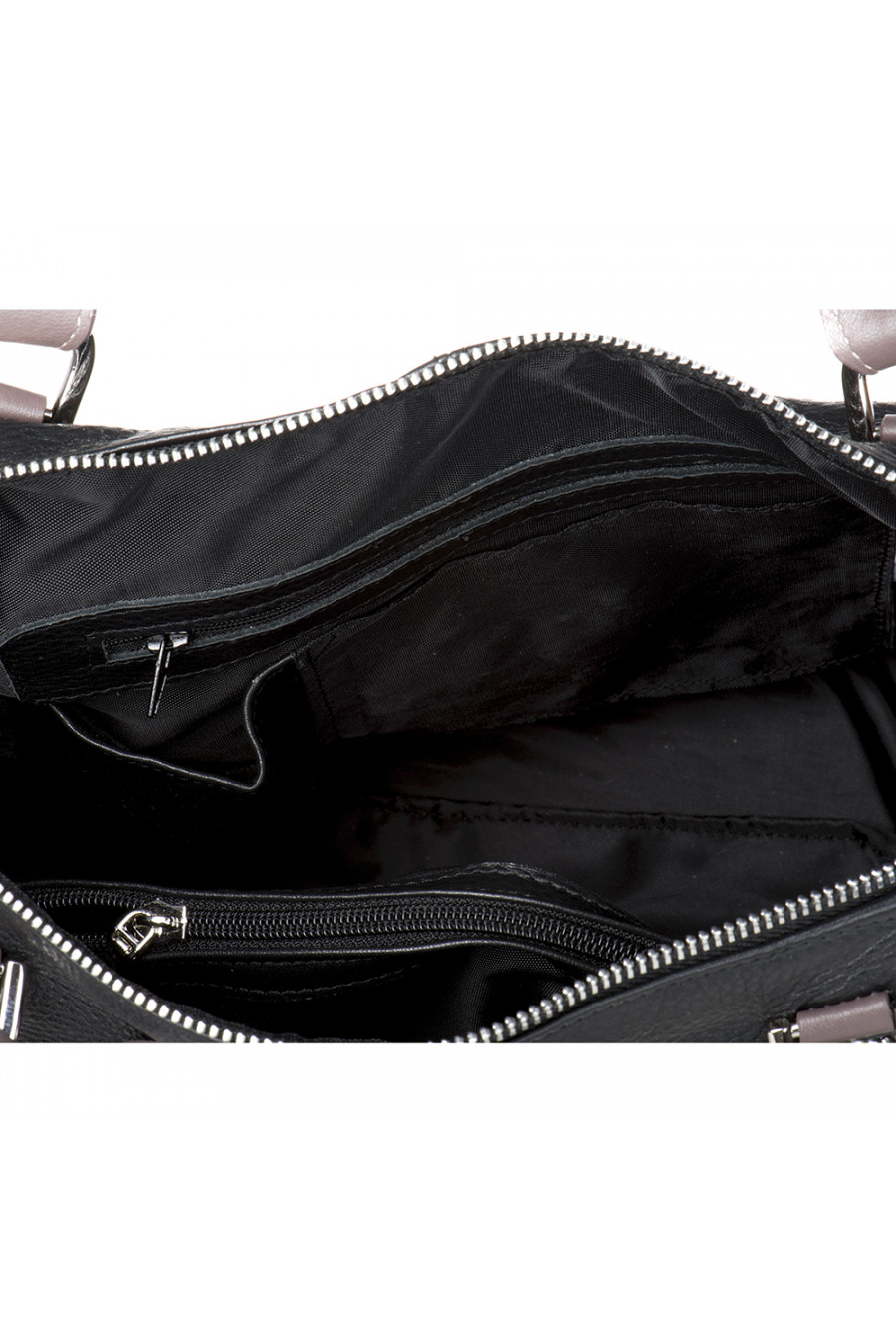 Снаружи: Одно отделение.На передней стенке- большое отделение на молнии.На задней стенке- карман на молнии и два кармашка для мелочей.