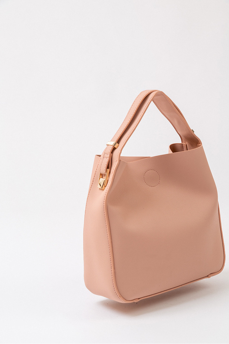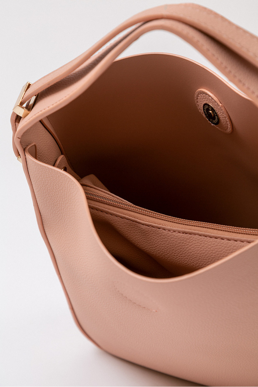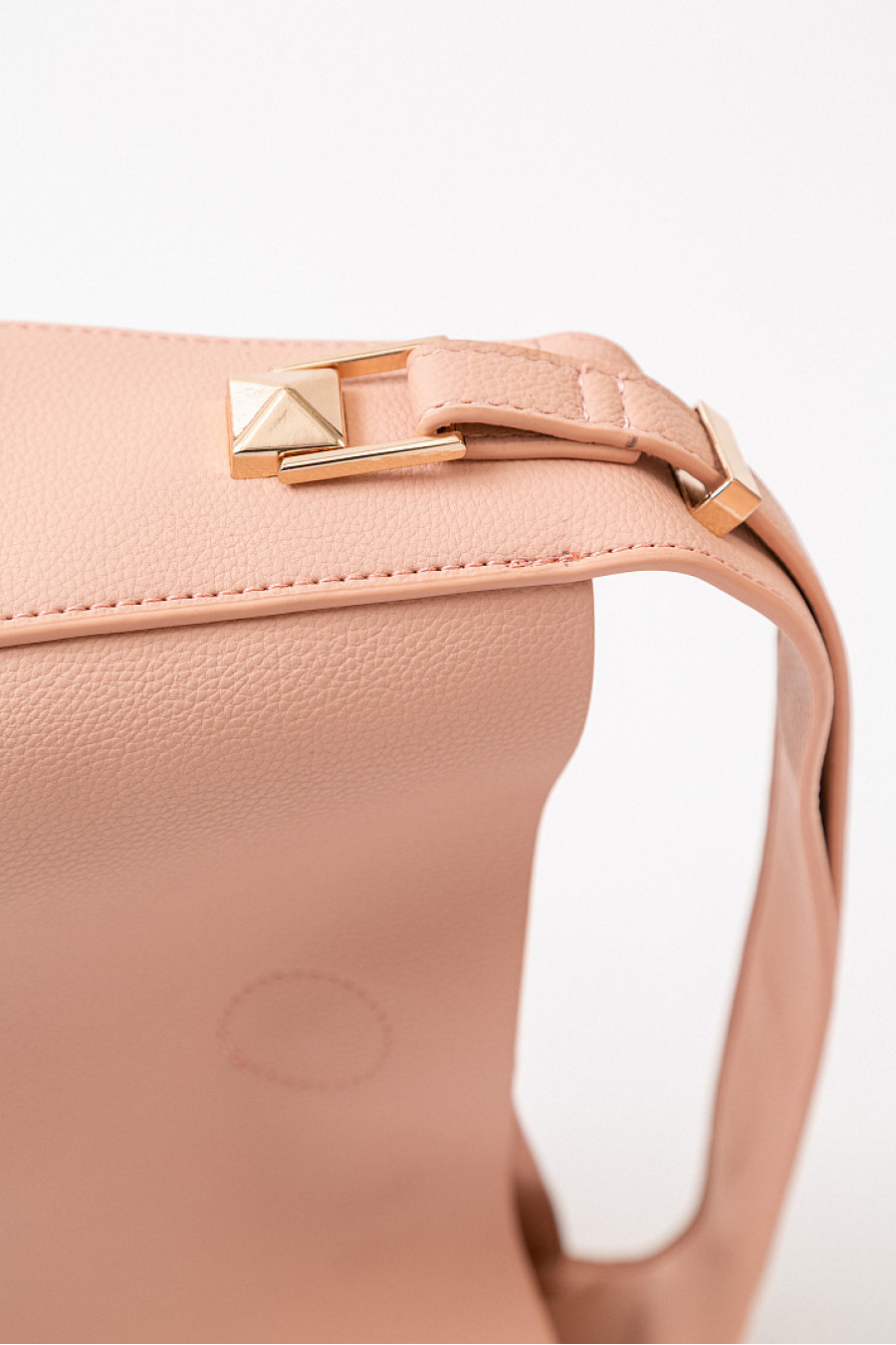 Сумка персикового цвета из экокожис металлическими деталями. Имеетручку и регулируемый плечевой ремень. Застежка на магнит.Внутри располагается маленькая сумка на молнии. Можно носить отдельно. Имеет 3 кармана, из которых один на молнии. Размеры (длина x высота x ширина): 28 x 26 x 11 см.