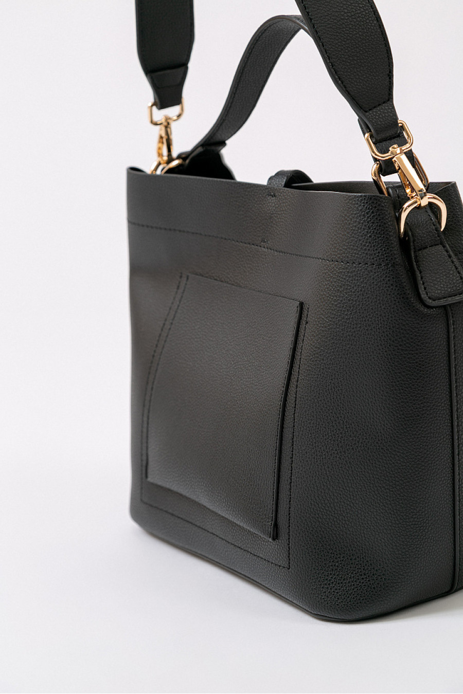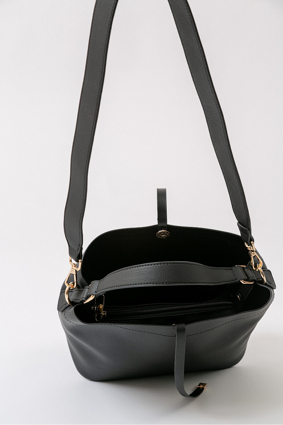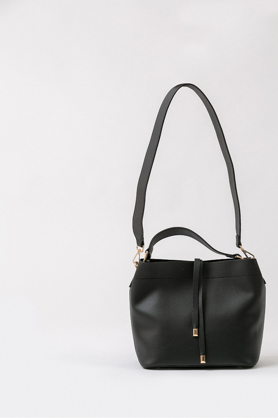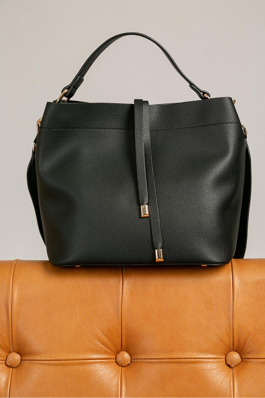 Сумка черного цвета из экокожи. Имеетпередний карман, шнурки с металлическими наконечниками, ручку и съемный плечевой ремень. Застежка на магнит.На дне аксессуара - металлические ножки.Внутри располагается маленькая сумка на молнии. Можно носить отдельно. Имеет 3 кармана, из которых один на молнии. Размеры (длина x высота x ширина): 26 x 25 x 15 см.