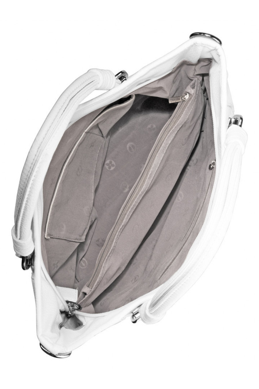 Внутри два отделения, разделенные карманом на молнии. Внутри кармашек для мобильного телефона, карман на молнии и карман без молнии. Сумка закрывается на молнию.