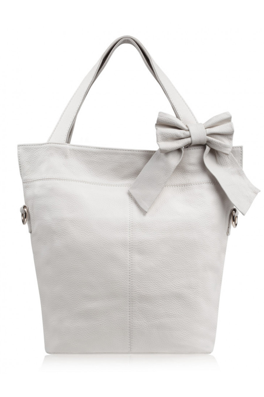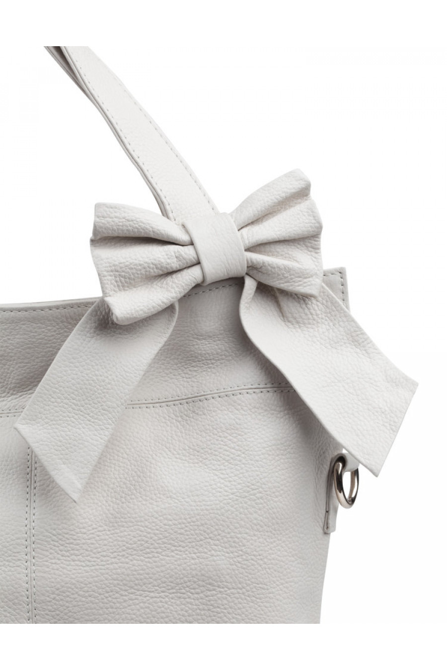 Очень позитивная сумка из натуральной кожи. Удобная форма, вмещает документы размера А4. Бант крепится на заклепку и при желании снимается. Также есть длинный ремень, чтобы носить сумку через плечо. Цвет молочный.