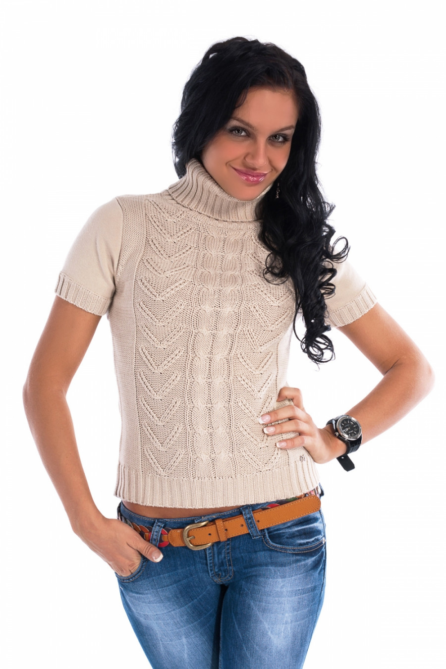 Женский свитер вязаного типа. Облегающий покрой. Высокий воротник с подворотом. Короткий рукав. На передней части свитера красивый узор в виде вязаных полосок.