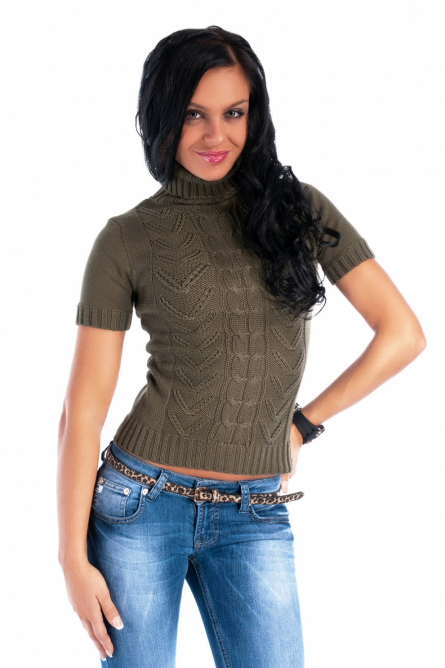 Женский свитер вязаного типа. Облегающий покрой. Высокий воротник с подворотом. Короткий рукав. На передней части свитера красивый узор в виде вязаных полосок.