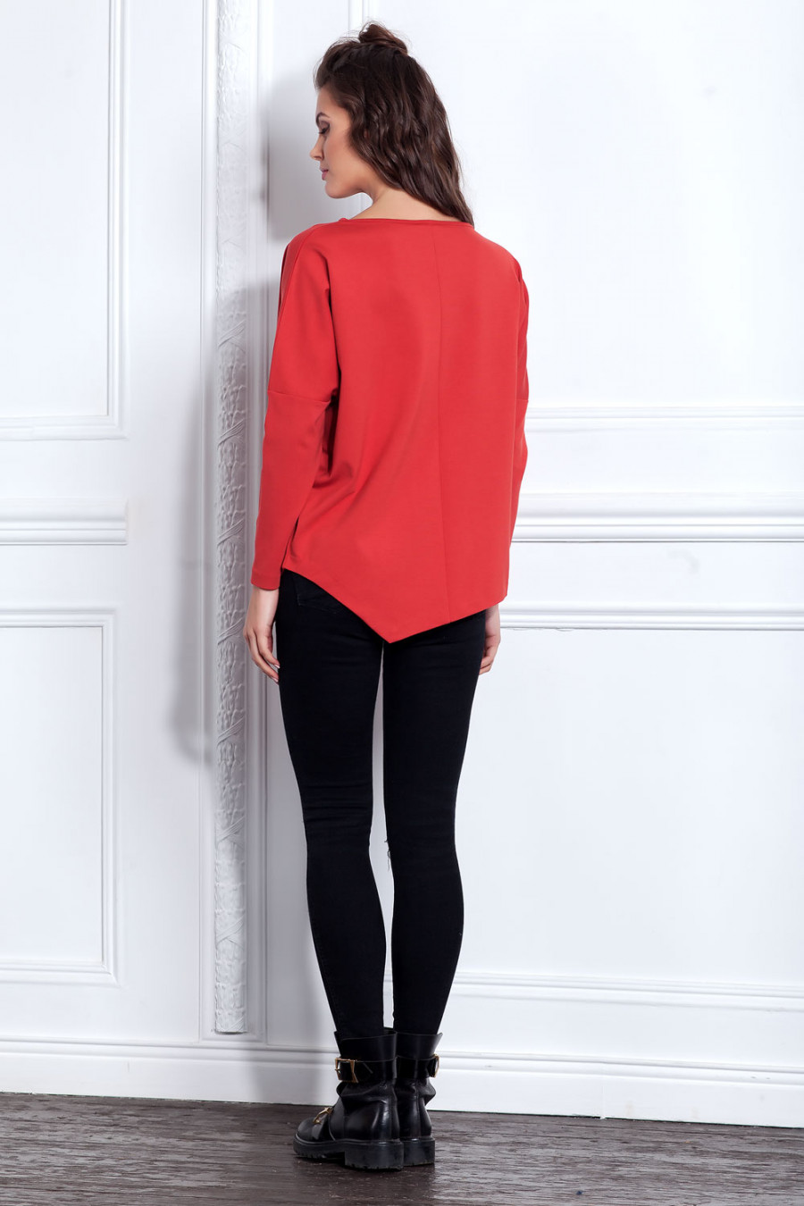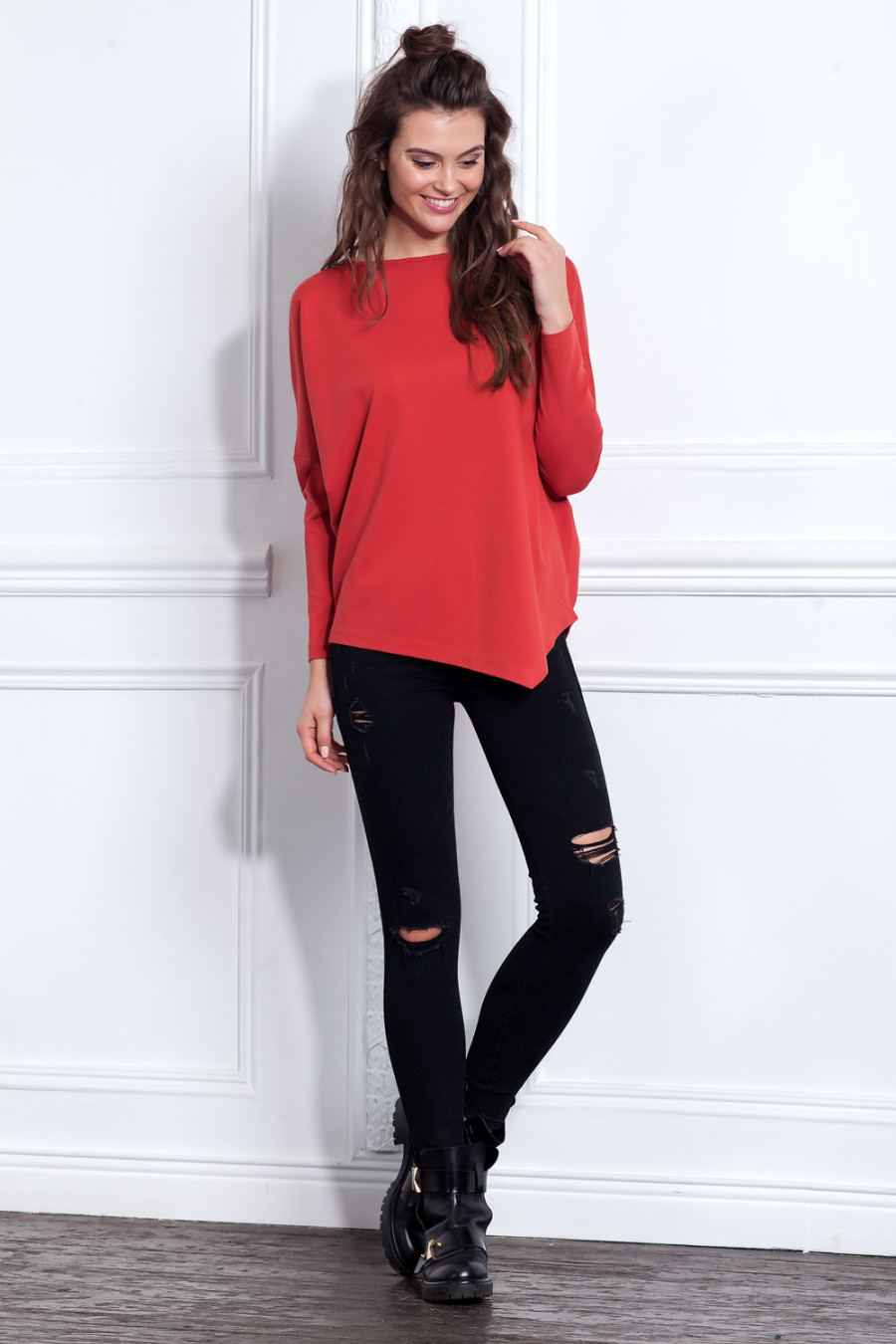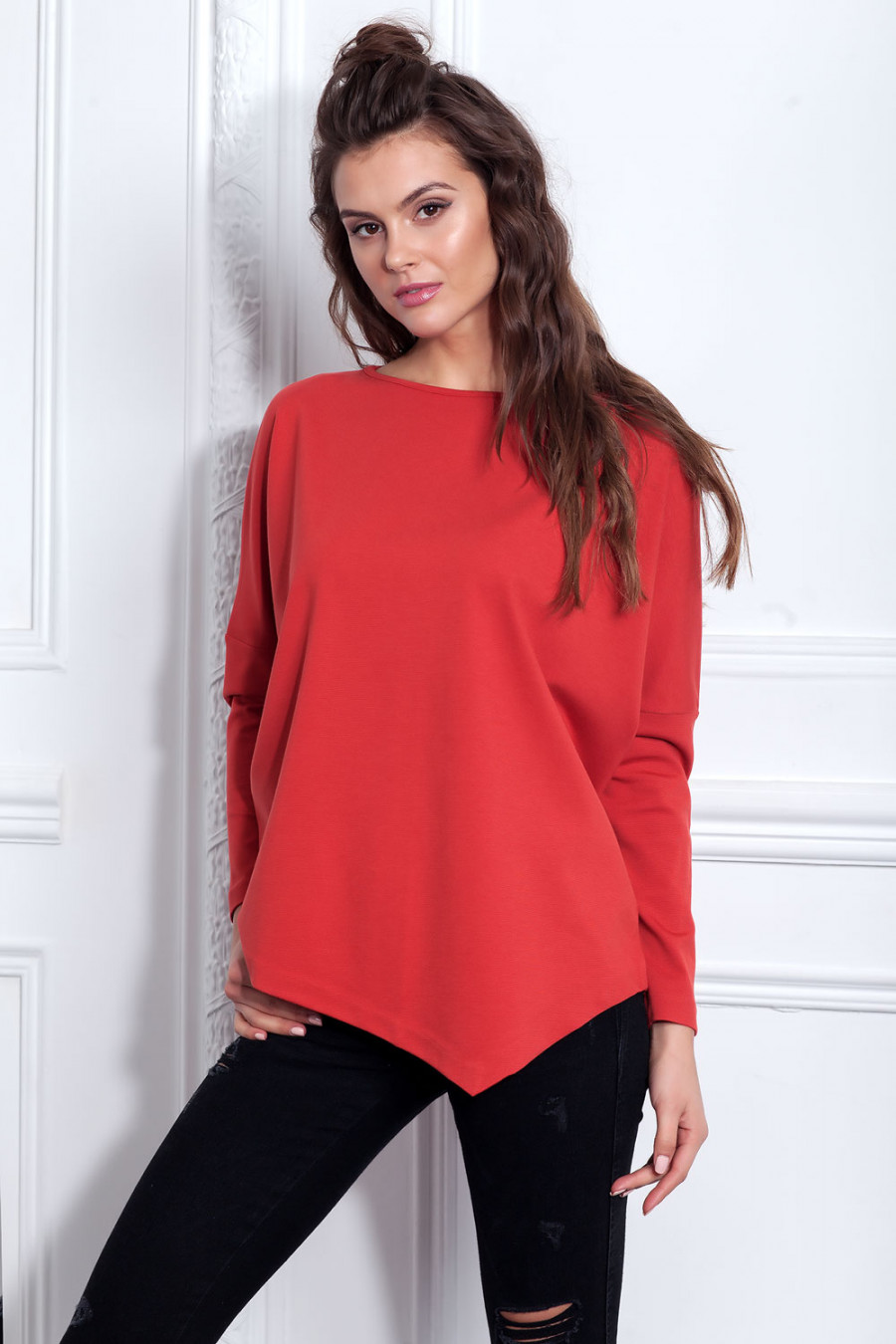 Стильный свитер с длинным рукавом из плотного однотонного трикотажа. Модель свободного покроя с асимметричной линией низа с углом. Свитер прекрасно сочетается с различными видами одежды.