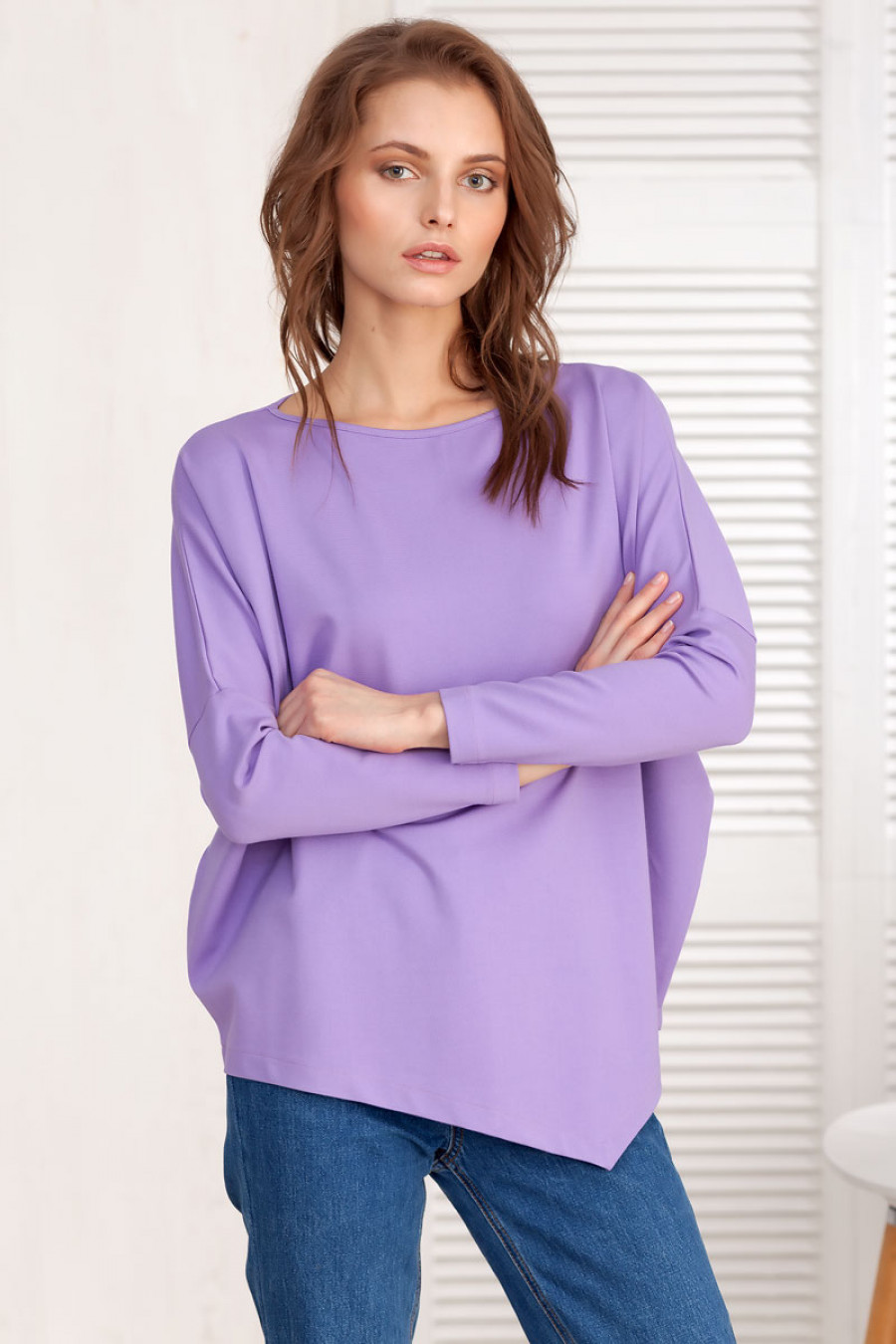 Стильный свитер с длинным рукавом из плотного однотонного трикотажа. Модель свободного покроя с асимметричной линией низа с углом. Свитер прекрасно сочетается с различными видами одежды.