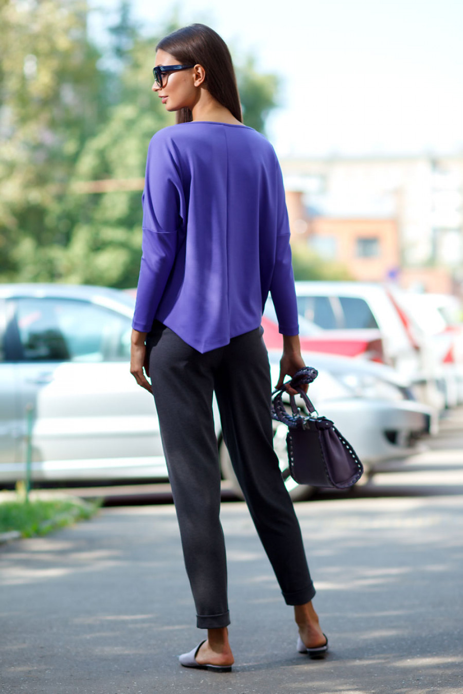 Стильный свитер с длинным рукавом из плотного однотонного трикотажа. Модель свободного покроя с асимметричной линией низа с углом. Свитер прекрасно сочетается с различными видами одежды.
