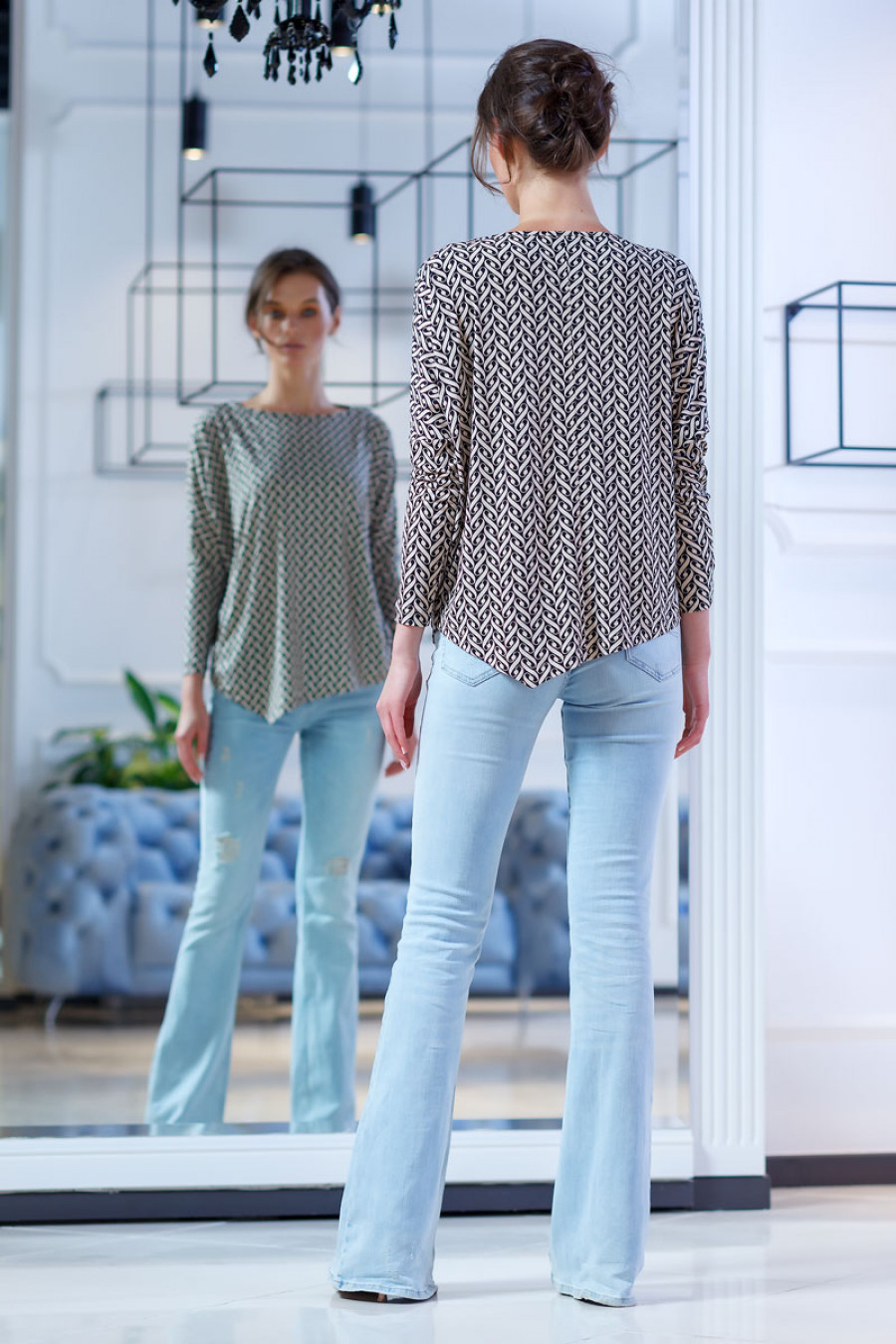 Оригинальный свитер из струящегося трикотажа с оригинальным принтом. Объемный крой с заниженной линией плеча с длинным рукавом. Асимметричная линия низа с углом добавляет динамичность модели. Свитер прекрасно сочетается с различными видами одежды.