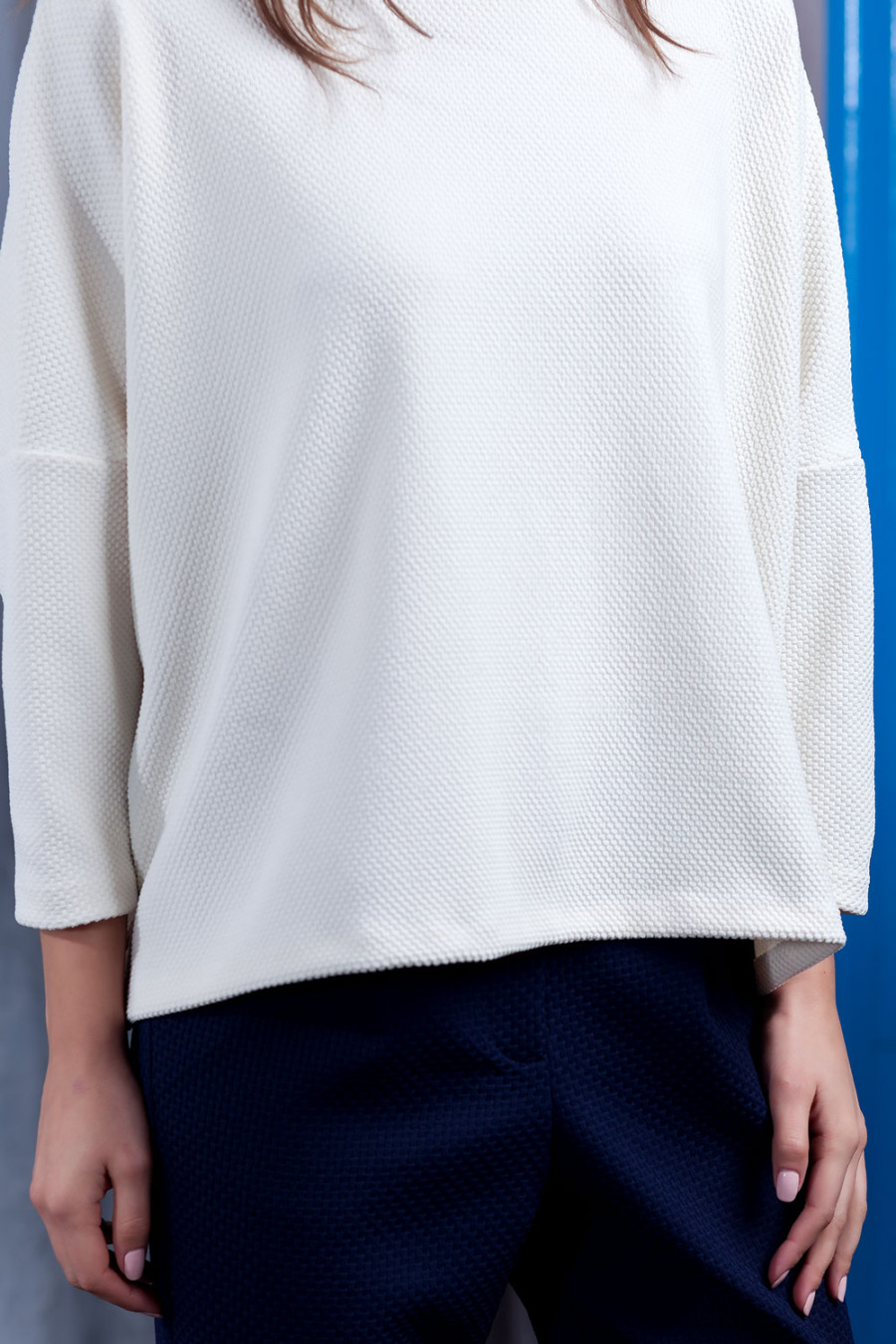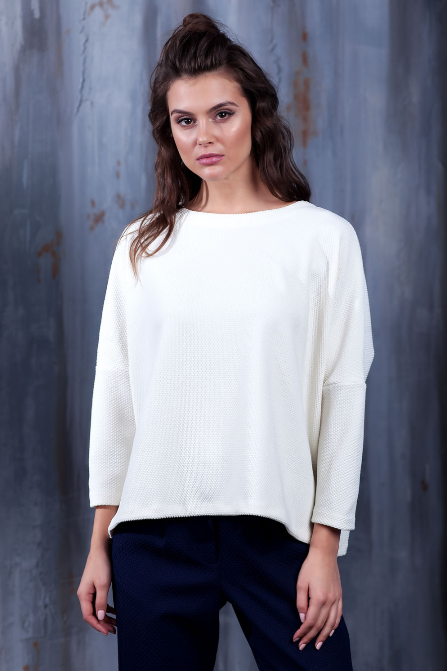Стильный свитер из приятного однотонного трикотажа с интересной фактурой. Очень широкий крой с заниженной линией плеч и небольшими разрезами по бокам идеально подходит для создания стильного непринужденного образа. Округлый вырез горловины оформлен планкой. Отличная основа для повседневных комплектов.