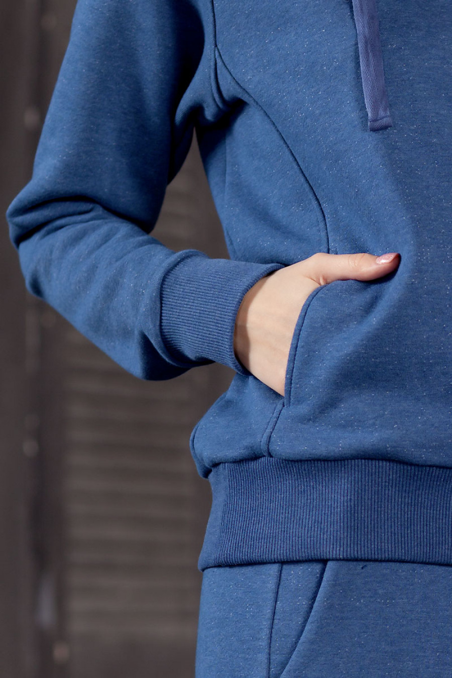 Классическая спортивная толстовка и з однотонного трикотажа с длинным рукавом. Модель с капюшоном и застежкой на металлическую молнию. В боковых швах обработаны карманы. Манжеты рукавов и пояс выполнены из ткани компаньона в мелкий рубчик.