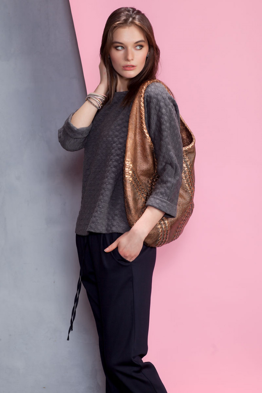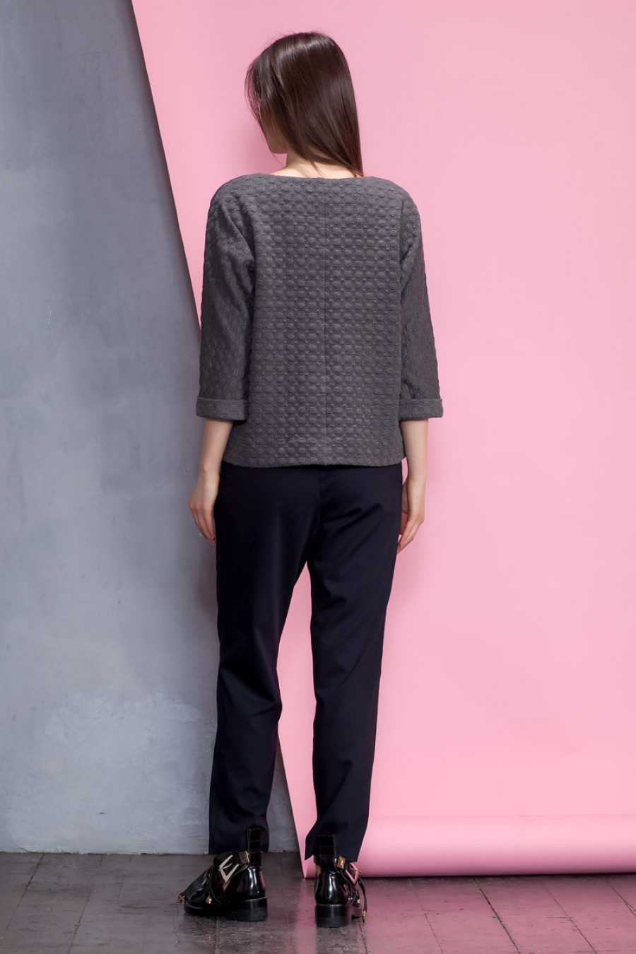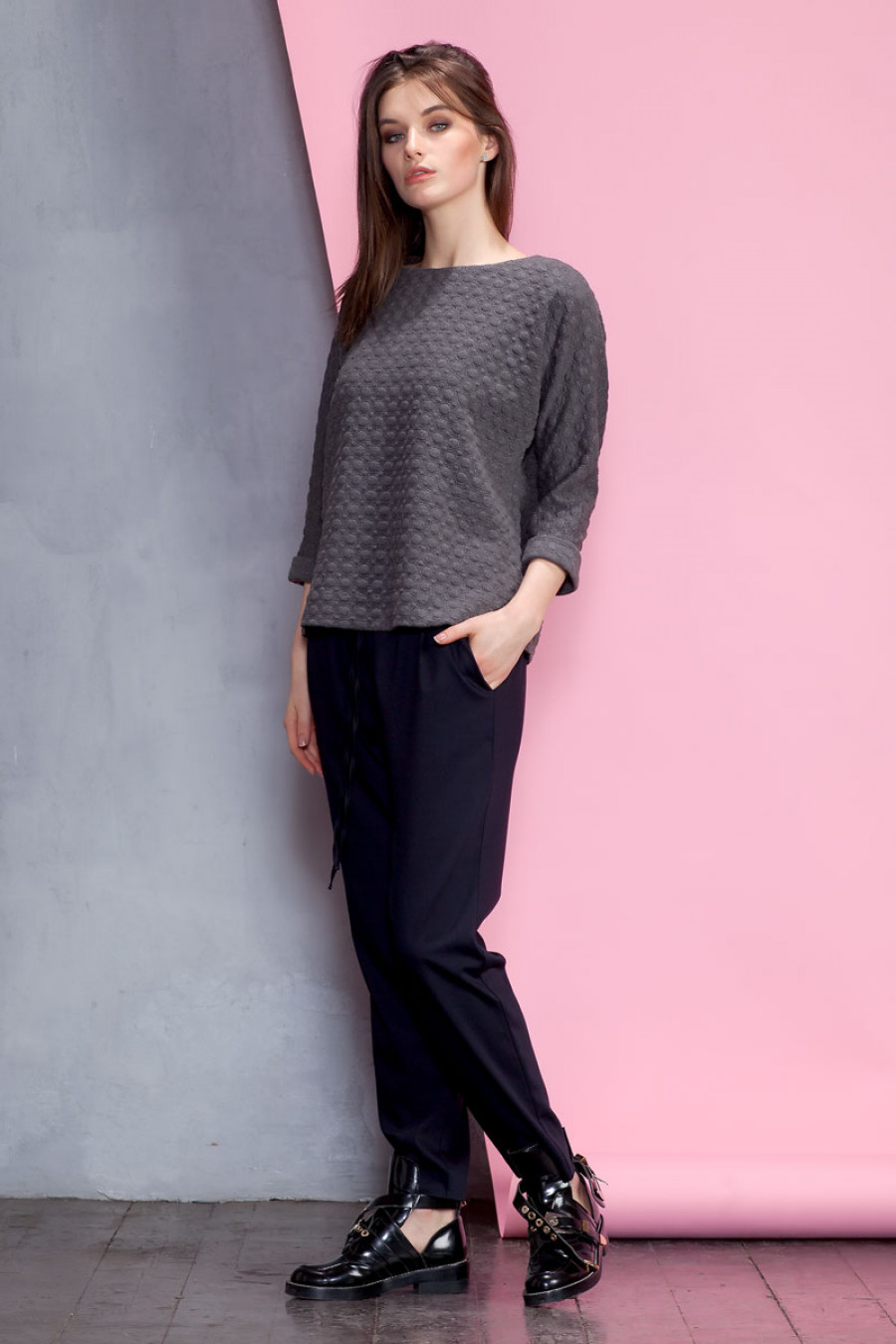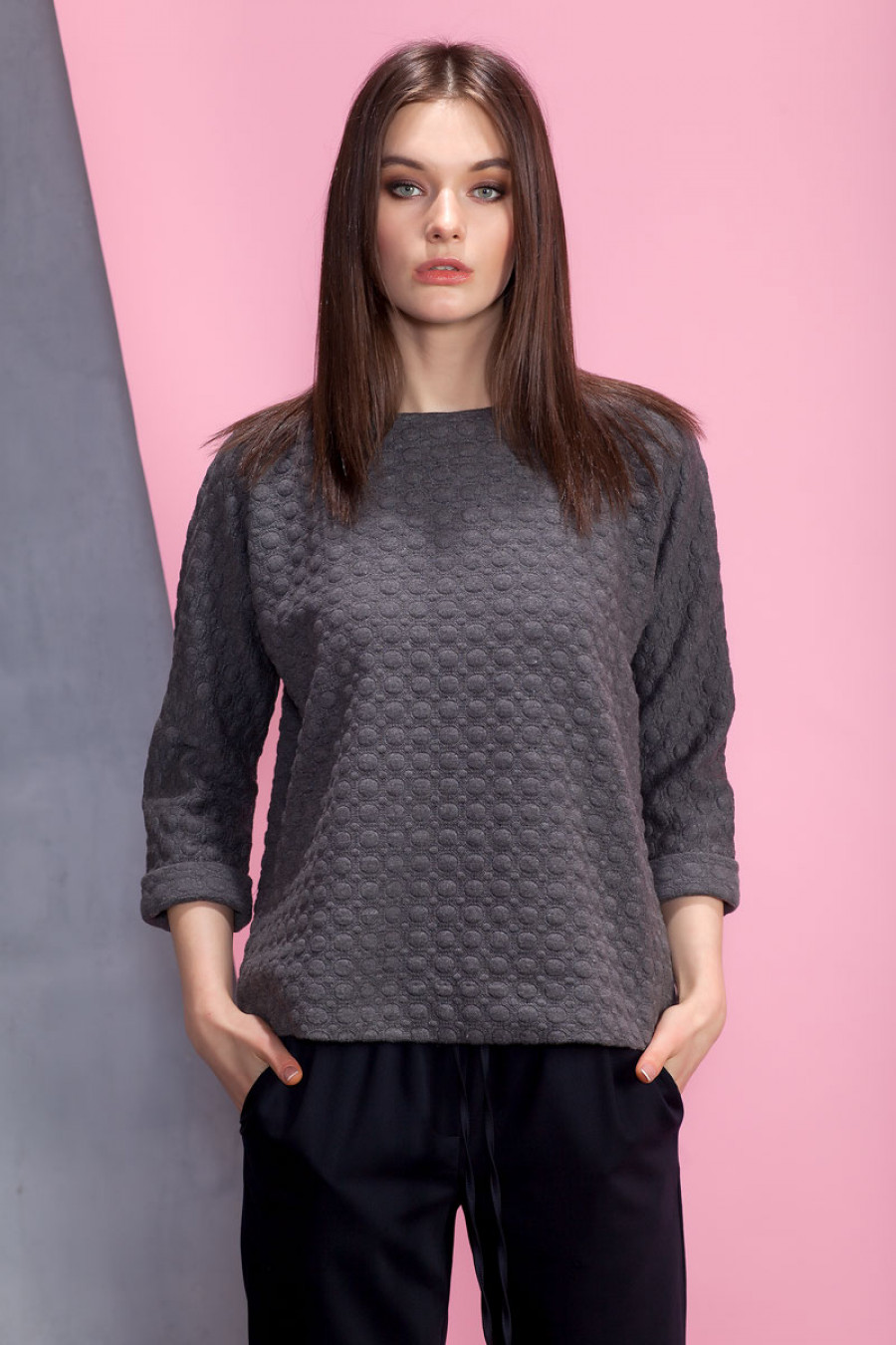 Эффектный свитшот из трикотажа с интересной объемной структурой. Модель свободного кроя с цельнокроенным рукавом 3/4 с манжетом. Отличный вариант для создания образов на каждый день.