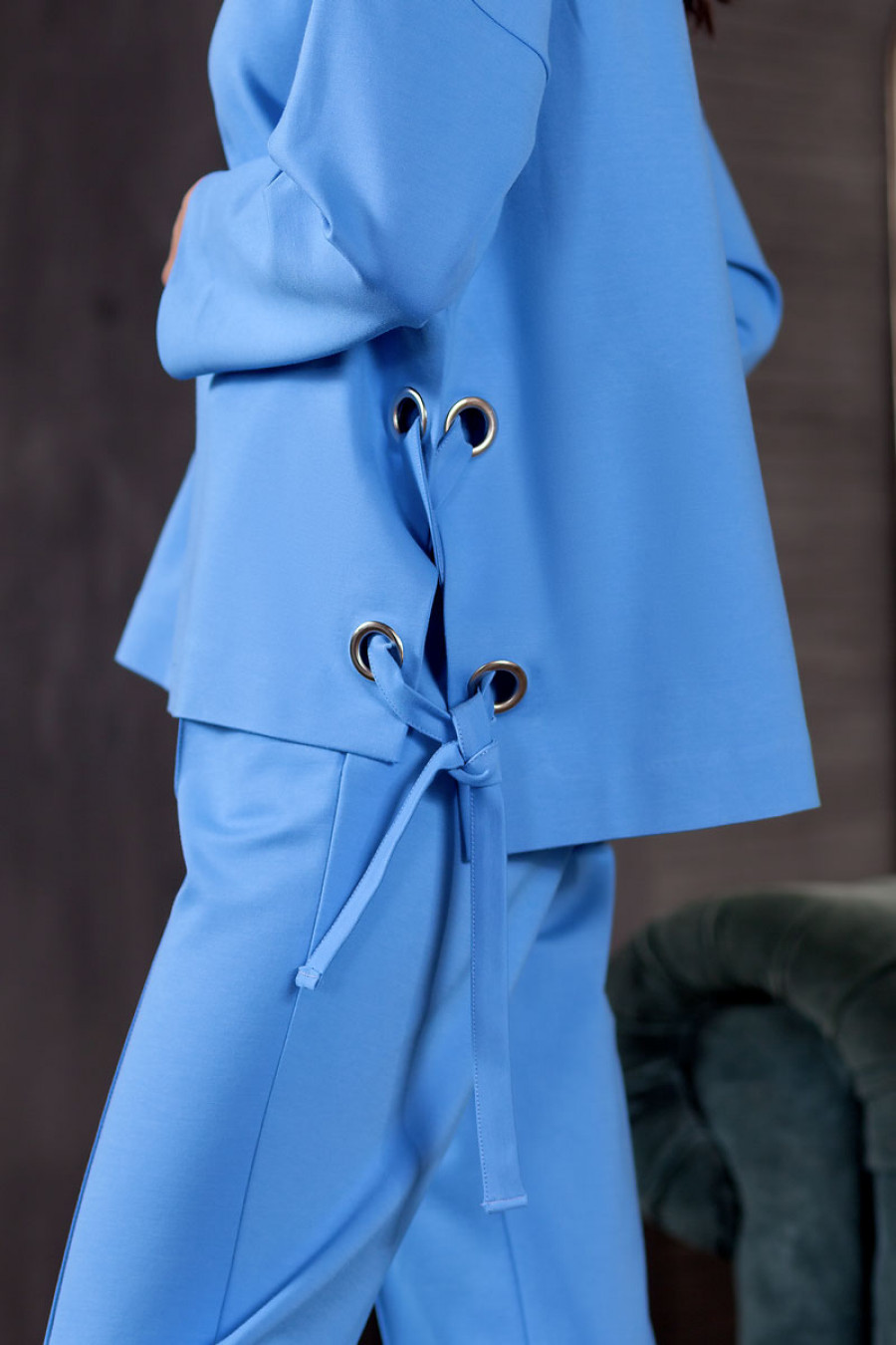 Стильный свитшот из плотного джерси. Модель прямого силуэта с длинным рукавом. По бокам выполнены разрезы, декорированные люверсами с декоративными лентами.