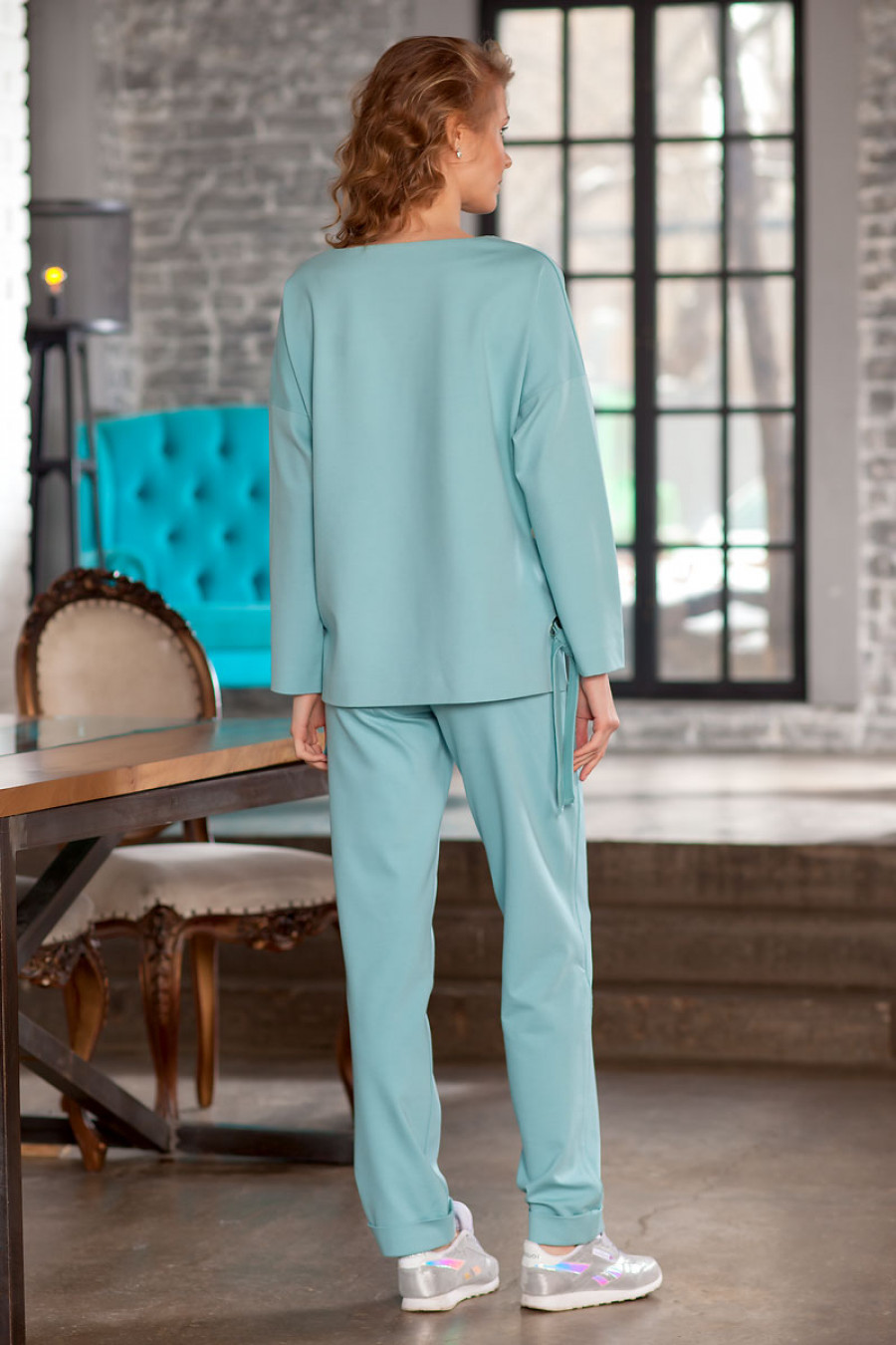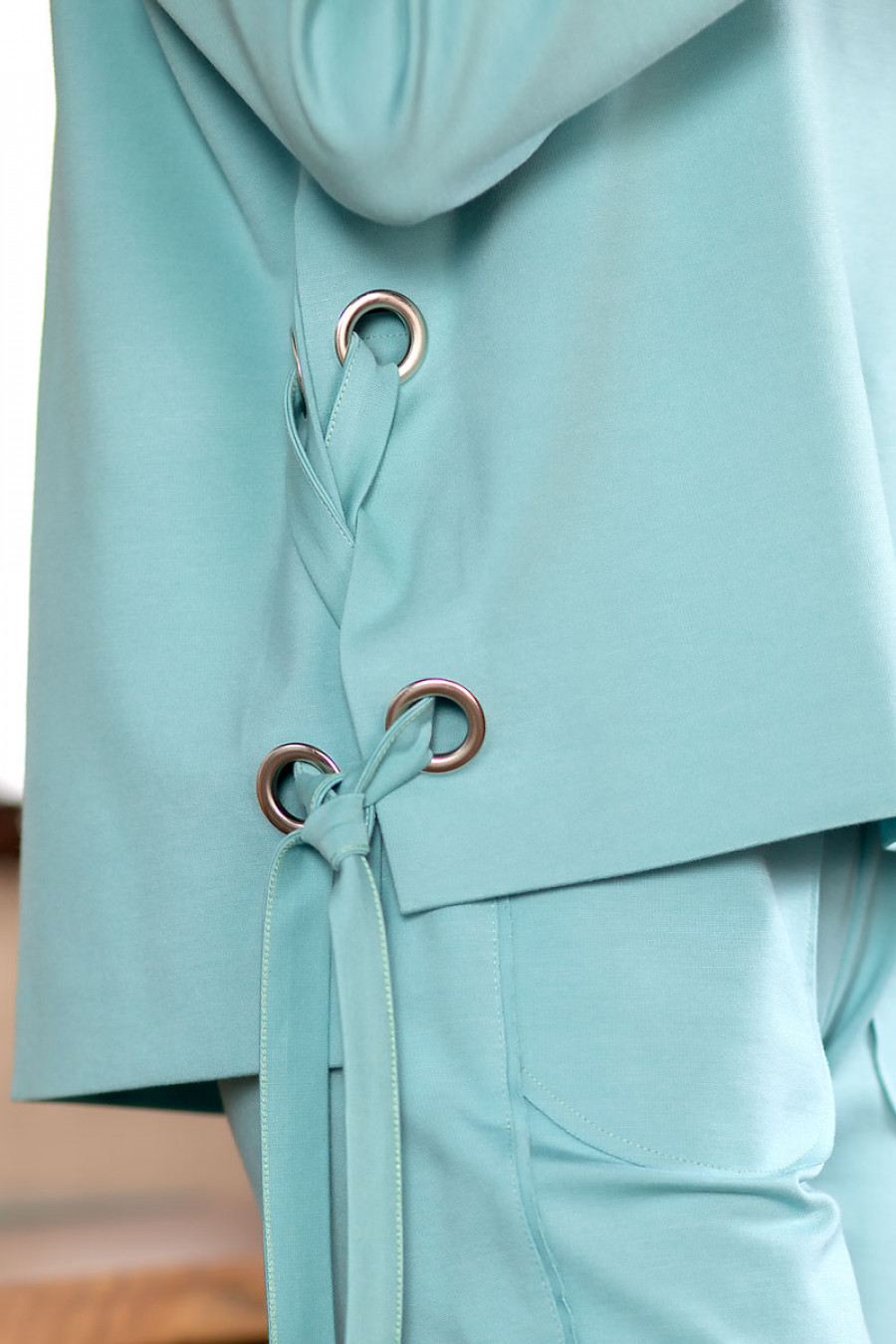 Стильный свитшот из плотного джерси. Модель прямого силуэта с длинным рукавом. По бокам выполнены разрезы, декорированные люверсами с декоративными лентами.