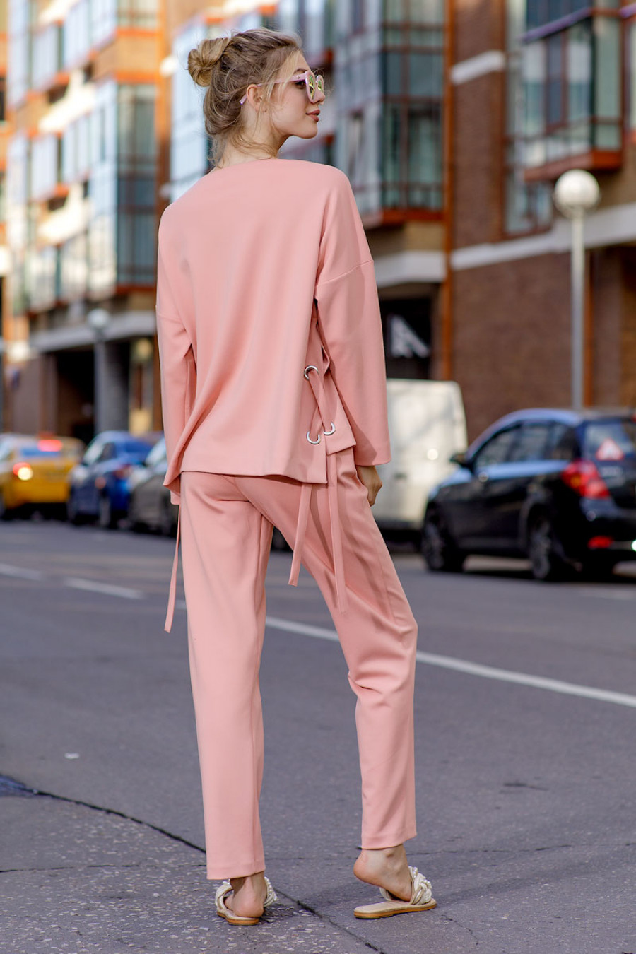 Стильный свитшот из однотонного джерси. Модель прямого силуэта с длинным рукавом. По бокам выполнены разрезы, декорированные люверсами с декоративными лентами.