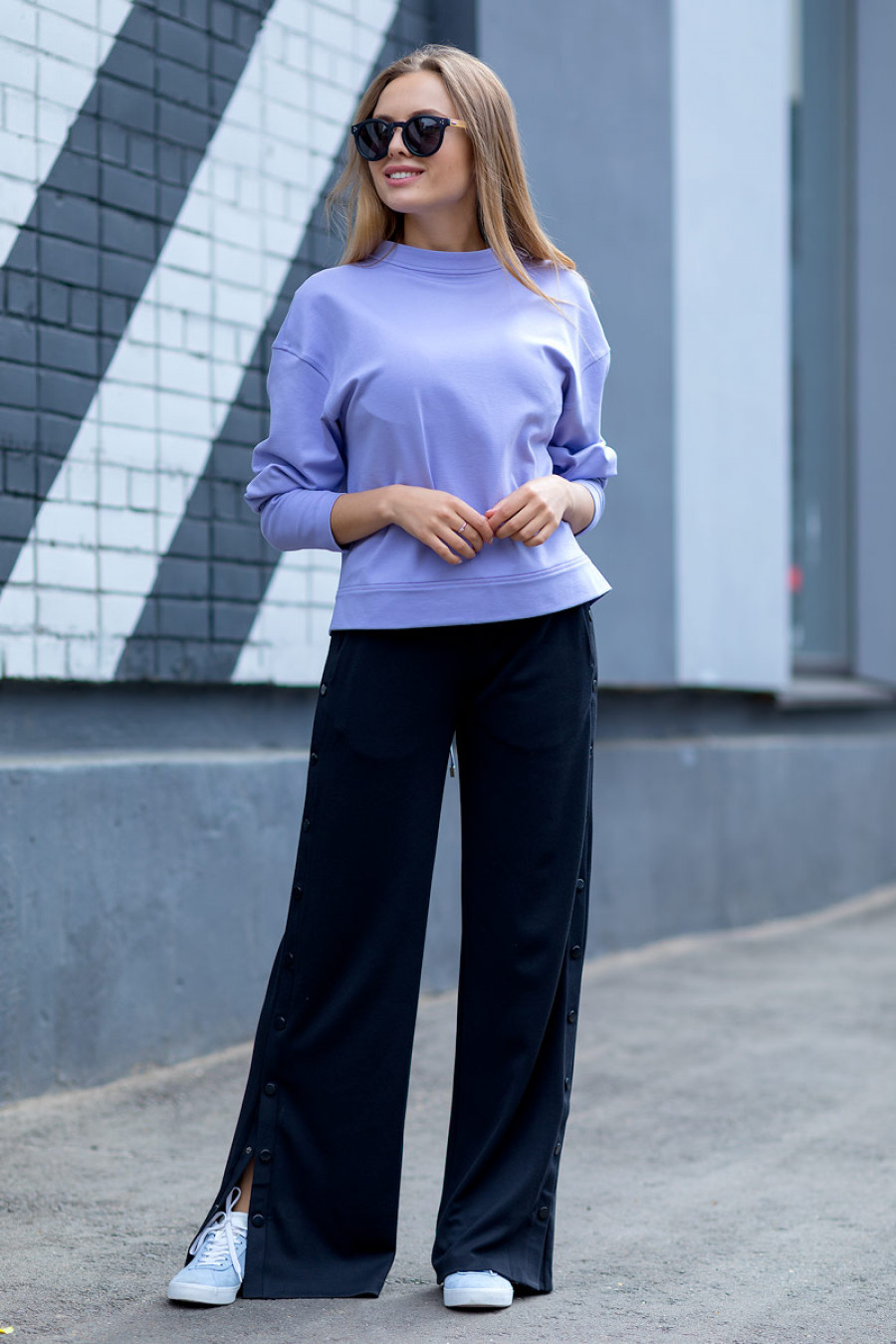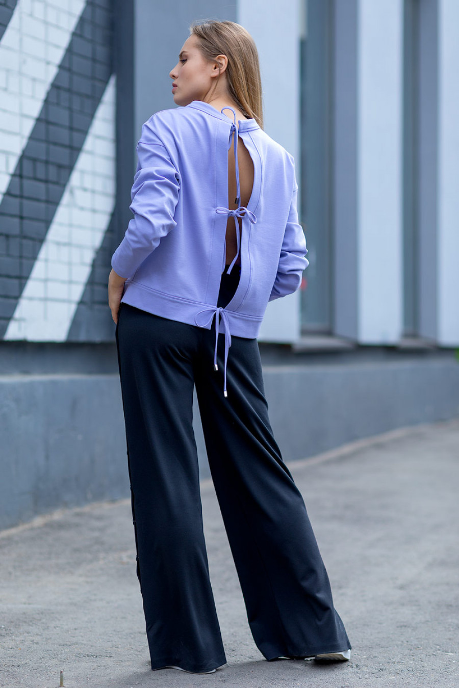 Стильный свитшот из однотонного джерси. Модель свободного кроя с длинным рукавом и аккуратной стойкой. На спинке застежка из завязок на три бантика.