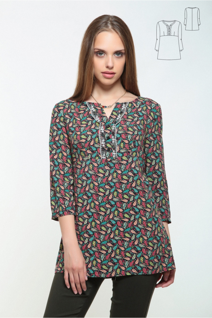 Туника свободного покроя и рукавом 3/4 со сложным рисунком оживит ваш образ и придаст ему легкости