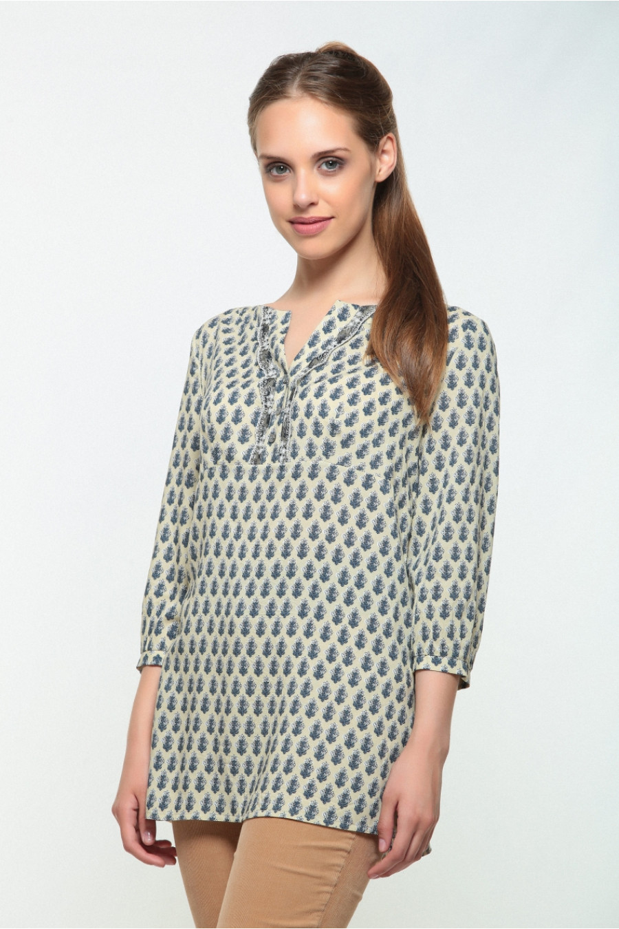 Туника свободного покроя и рукавом 3/4 со сложным рисунком оживит ваш образ и придаст ему легкости