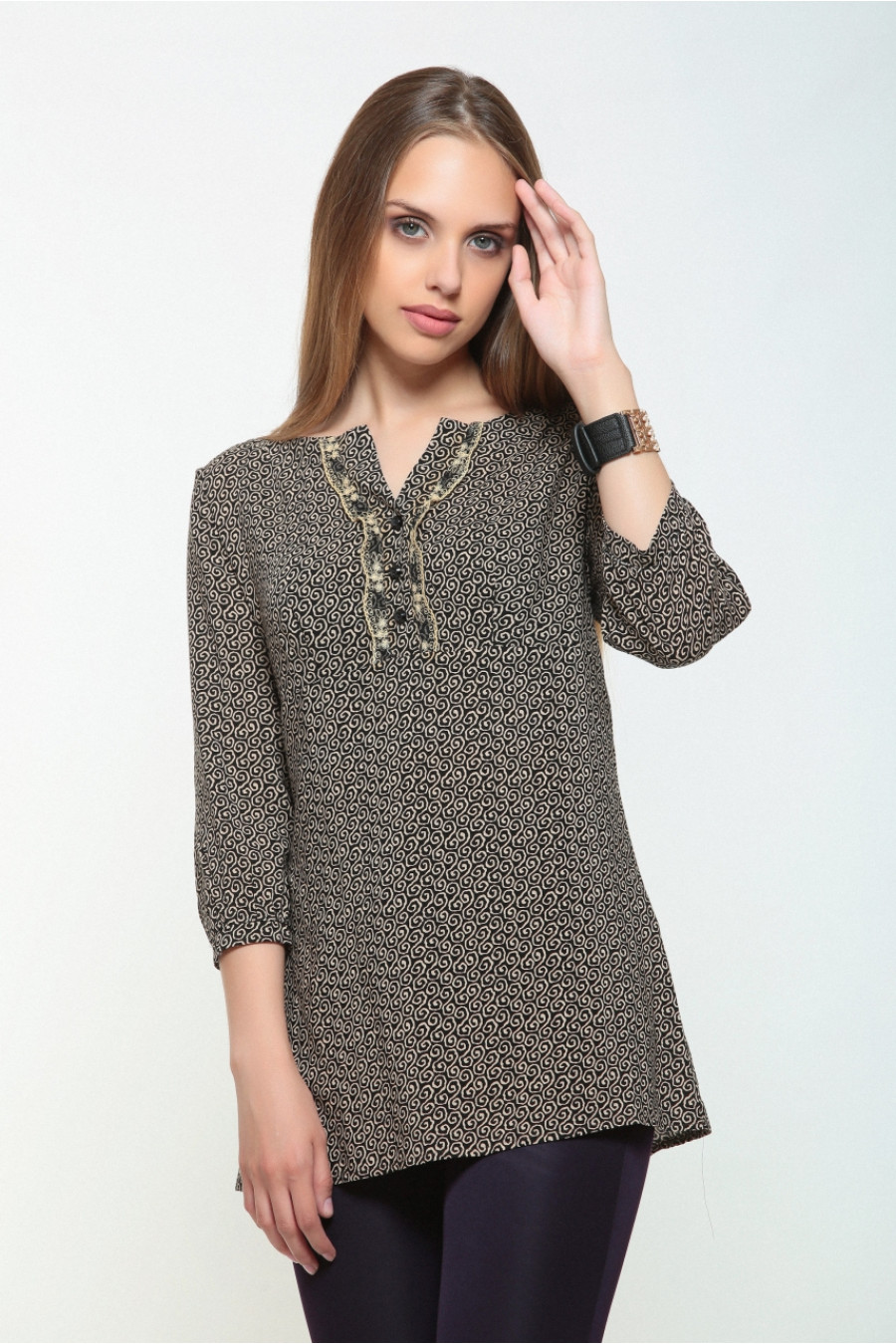 Туника свободного покроя и рукавом 3/4 со сложным рисунком оживит ваш образ и придаст ему легкости