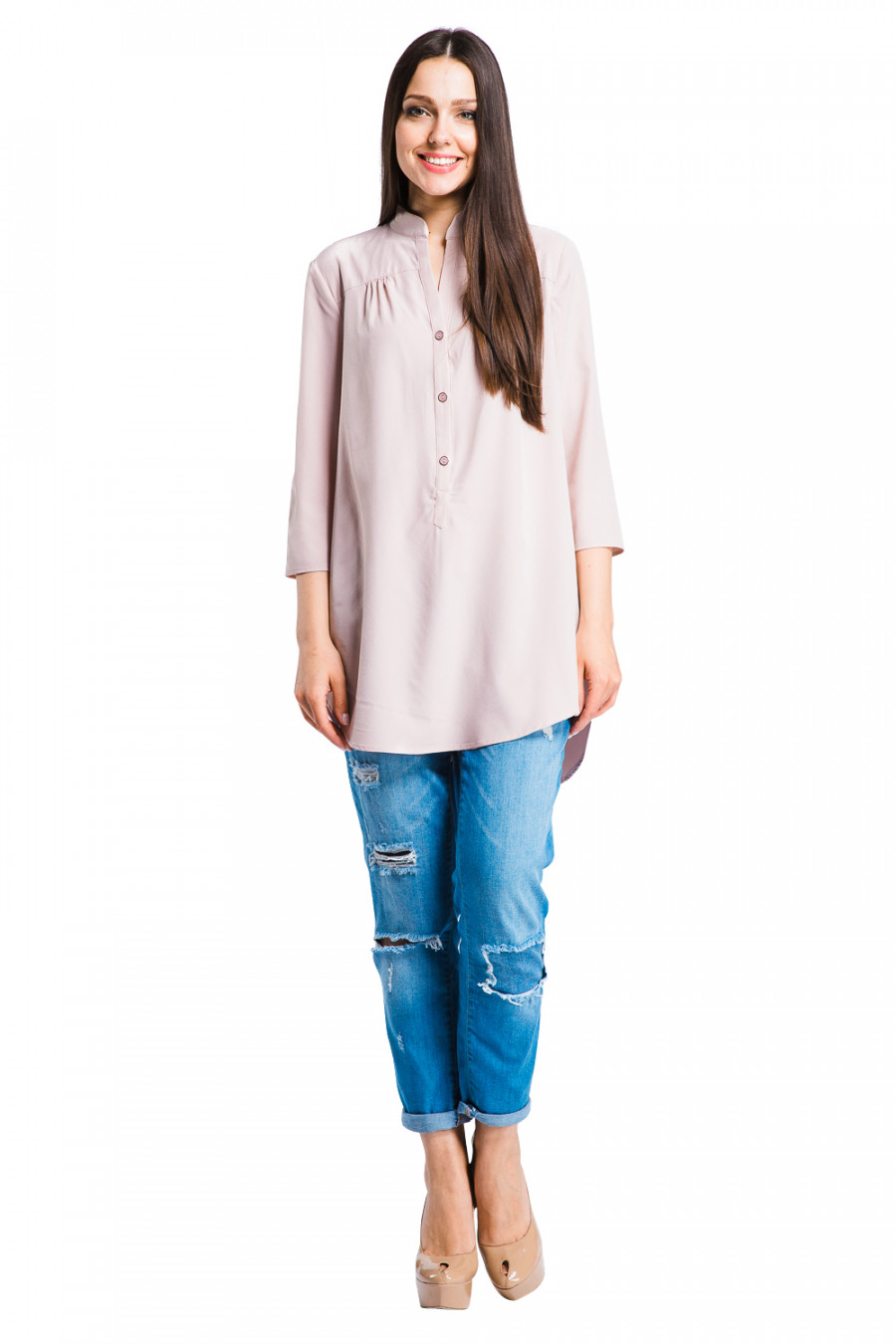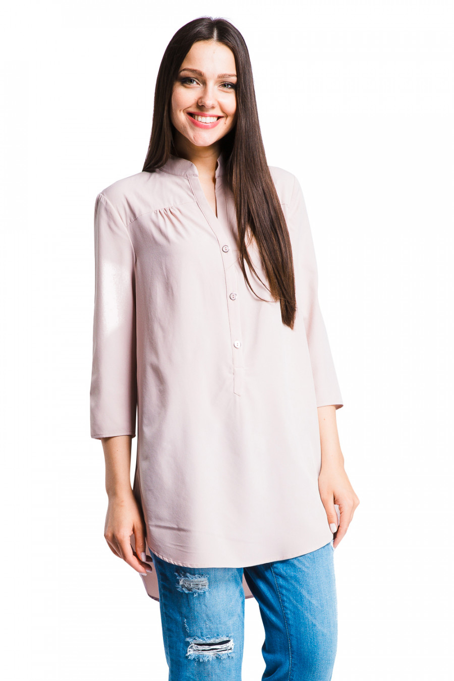 Лёгкая удлинённая туника из тонкой ткани. Модель свободного кроя с укороченными рукавами. Ворот-стойка с застёжкой по центральной линии на планку с пуговицами. Передняя часть укороченная с закругленными краями по бокам. Сзади по спинке небольшая сборка. Выполнена из легкого креп-шифона светлых тонов.Прекрасная модель для летнего отдыха.