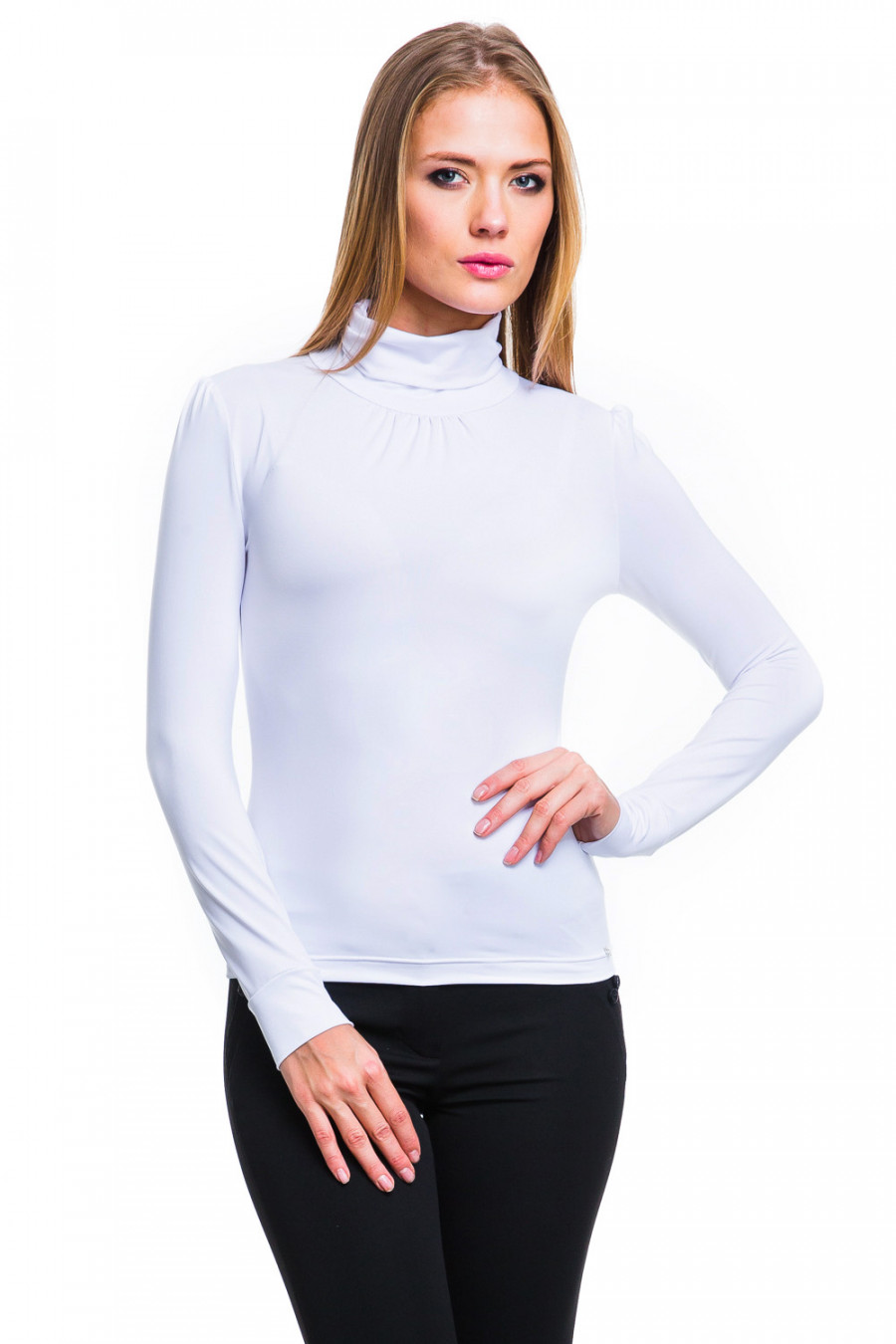 Замечательная водолазка с воротником-гольф и длинными рукавами. Модель выполнена из высококачественного материала, горловина ворота обработана в складку, на рукавах в плечевой части также небольшие сборки, нижняя часть рукава обработана манжетом. Модель будет прекрасно гармонировать с любыми предметами гардероба.