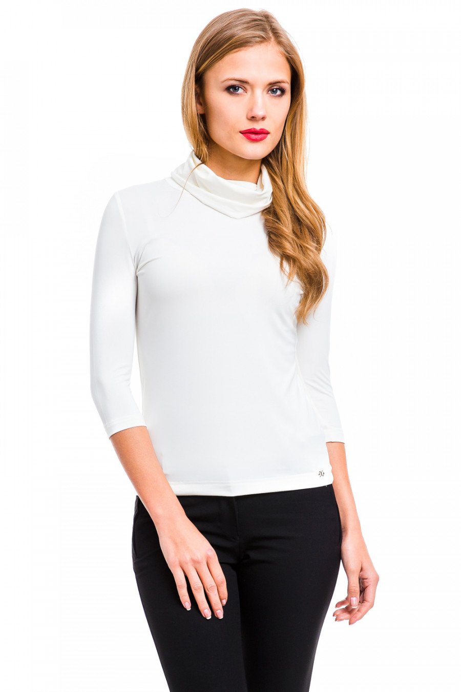 Стильная водолазка из микропилиэстра. Приталенный крой, модель с рукавами 3/4 и изящным воротником "хомут", который красиво создает объемные складки, сзади ворот немного удлинен. Швы модели выполнены частыми стежками, благодаря этой обработке швы очень прочные и не подвергаются деформированию.