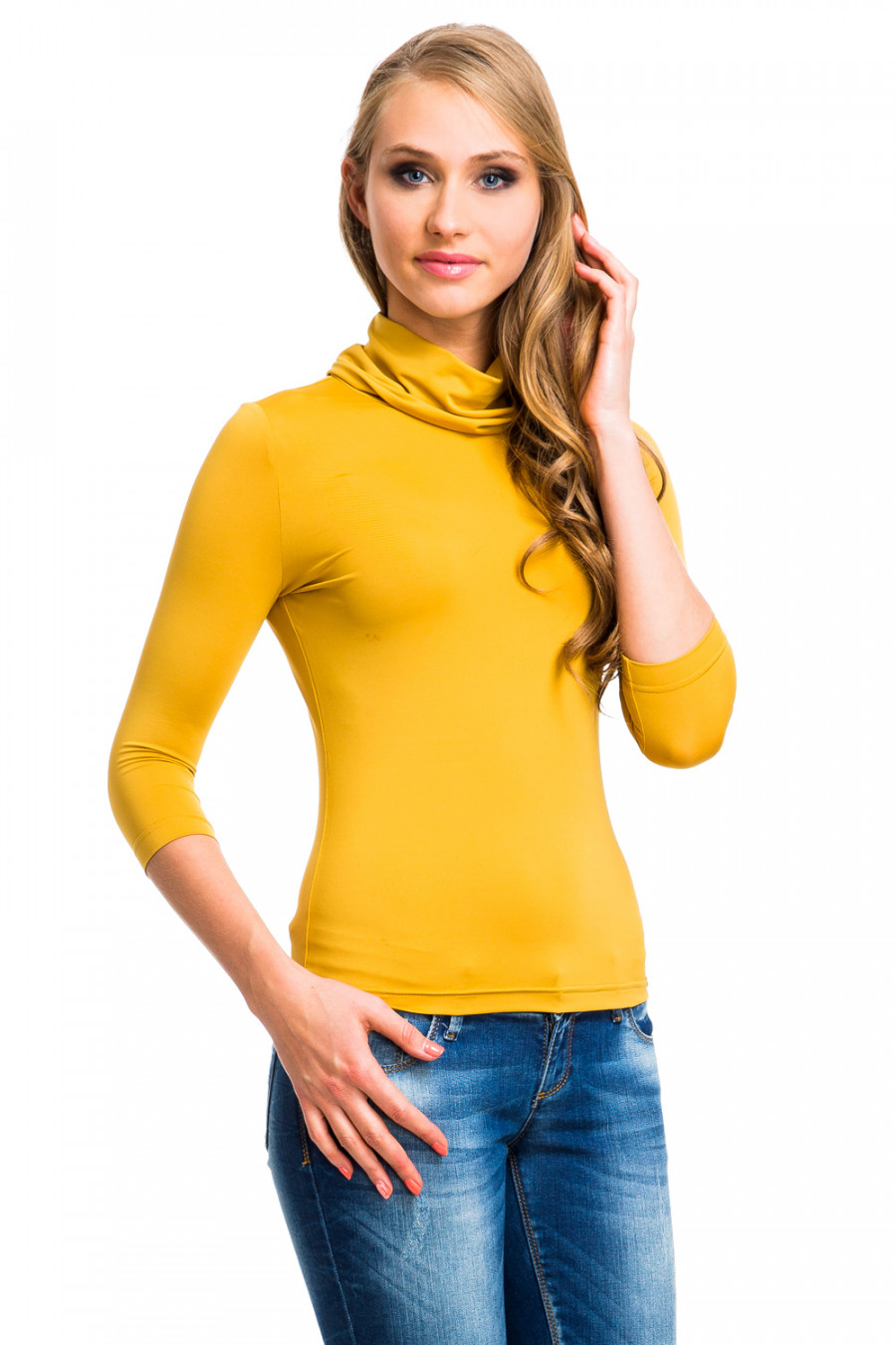 Стильная водолазка из микропилиэстра. Приталенный крой, модель с рукавами 3/4 и изящным воротником "хомут", который красиво создает объемные складки, сзади ворот немного удлинен. Швы модели выполнены частыми стежками, благодаря этой обработке швы очень прочные и не подвергаются деформированию.