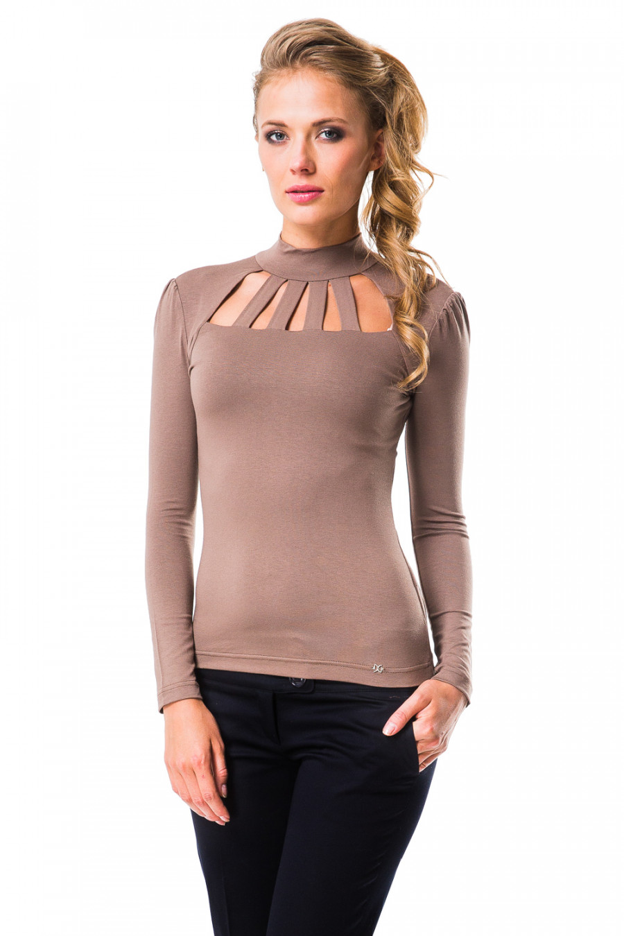 Оригинальная модель водолазки приталенного кроя с длинным рукавом и горловиной-стойкой. Изделие выполнено из высококачественного материала. Изящество модели придают небольшие вырезы от линии горловины до линии груди, образуя очаровательный полукруг. Сзади горловина на застежке-две пуговицы.