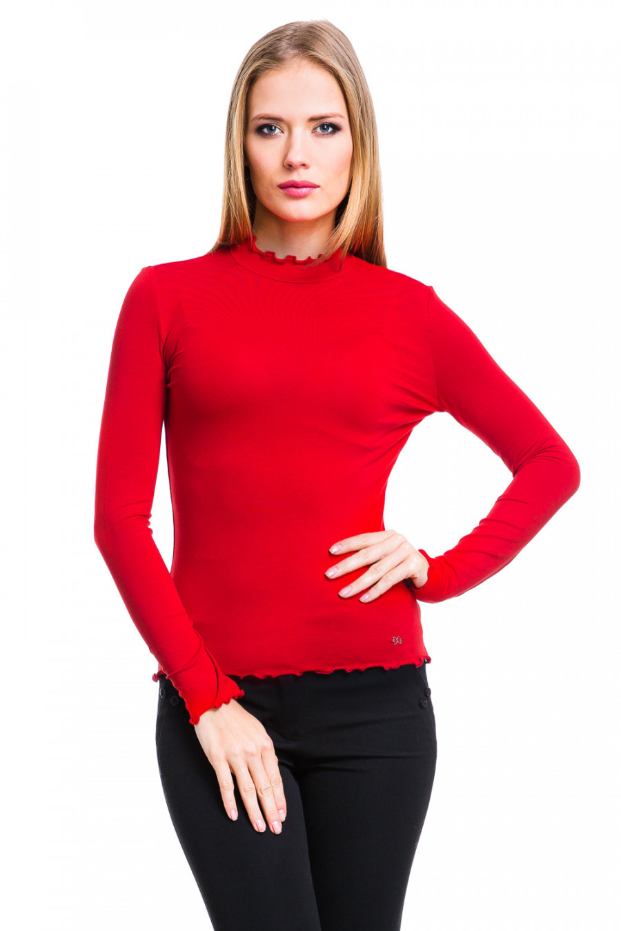 Очаровательная водолазка с длинным рукавом приталенного силуэта с воротником-стойкой. Модель выполнена из высококачественной вискозы. Нижняя часть изделия, манжеты и горловина обработаны специальным швом, что создает эффект волана.