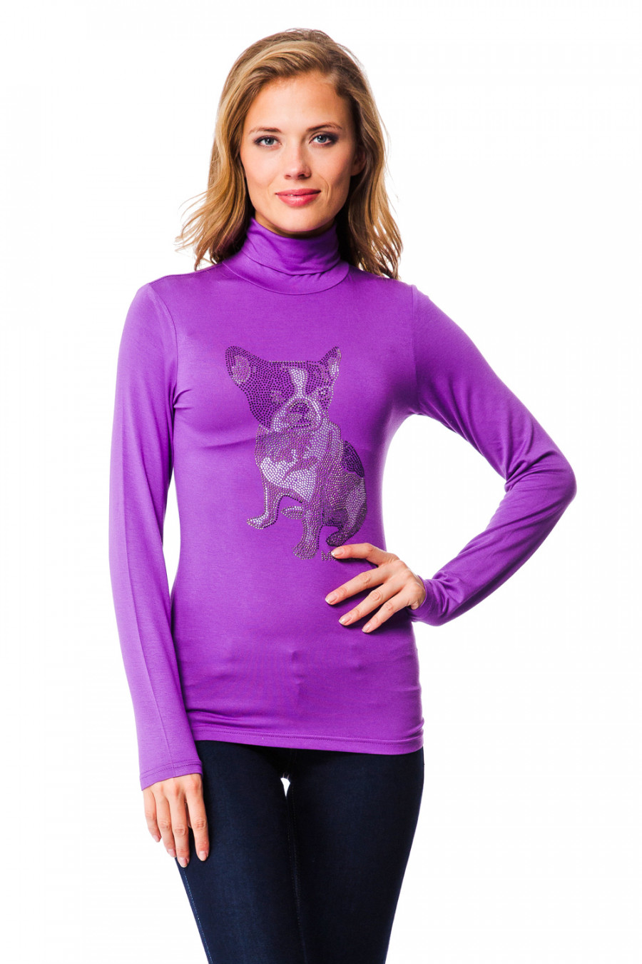 Удобная водолазка из вискозы и спандекса подойдет для молодой девушки. Водолазка с длинным рукавом, украшена рисунком собаки, выполненным в интересном полупрозрачном стиле. Модель подойдет в сочетании с классическими брюками, джинсами, прямой юбкой и с пиджаком.