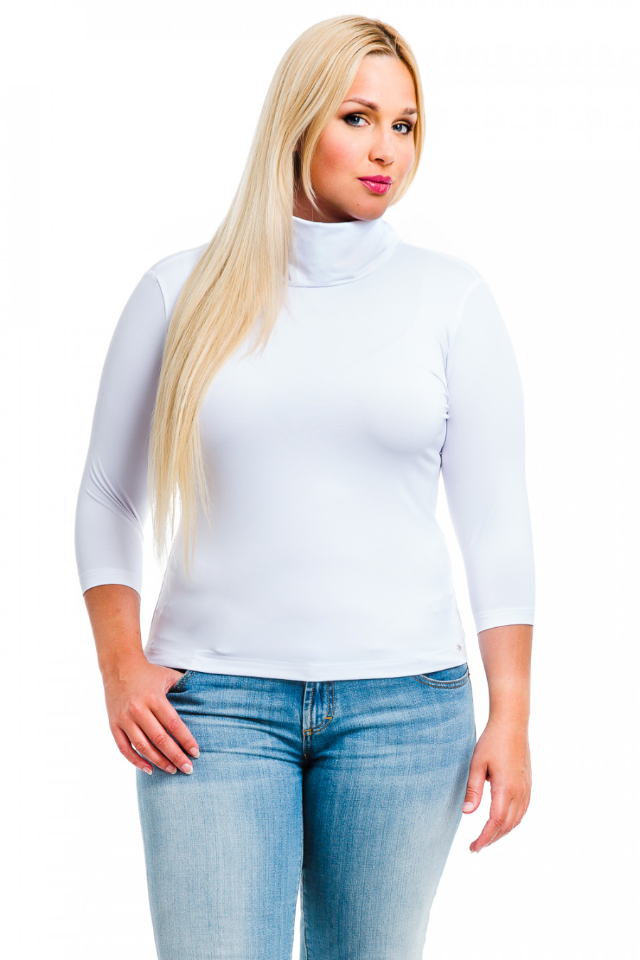 Стильная водолазка из микропилиэстра. Приталенный крой, модель с рукавами 3/4 и изящным воротником "хомут", который красиво создает объемные складки, сзади ворот немного удлинен. Швы модели выполнены частыми стежками, благодаря этой обработке швы очень прочные и не подвергаются деформированию.