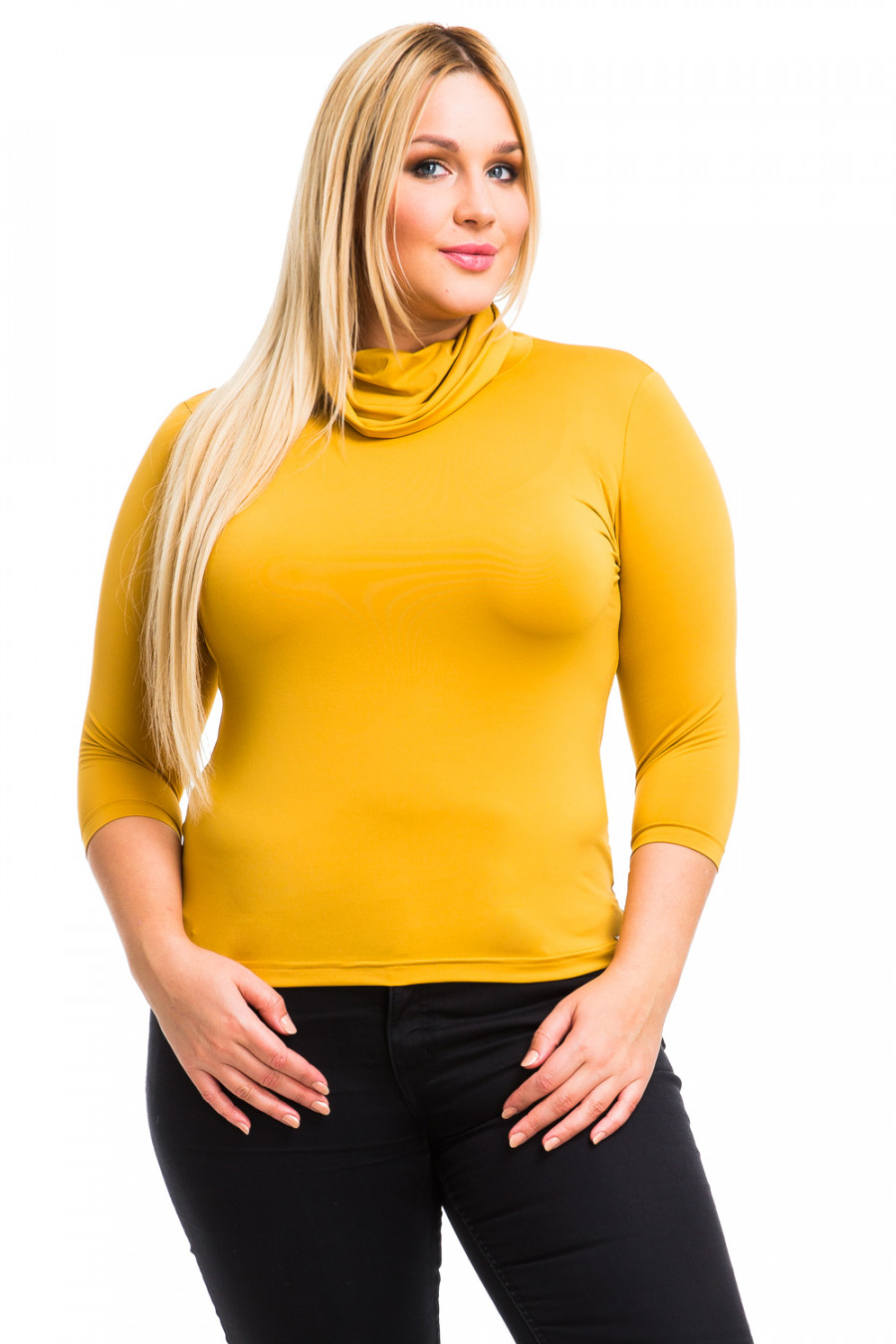 Стильная водолазка из микропилиэстра. Приталенный крой, модель с рукавами 3/4 и изящным воротником "хомут", который красиво создает объемные складки, сзади ворот немного удлинен. Швы модели выполнены частыми стежками, благодаря этой обработке швы очень прочные и не подвергаются деформированию.
