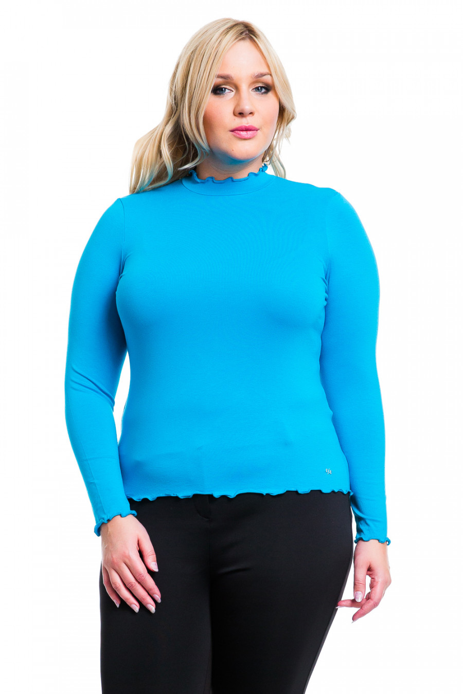 Очаровательная водолазка с длинным рукавом приталенного силуэта с воротником-стойкой. Модель выполнена из высококачественной вискозы. Нижняя часть изделия, манжеты и горловина обработаны специальным швом, что создает эффект волана.