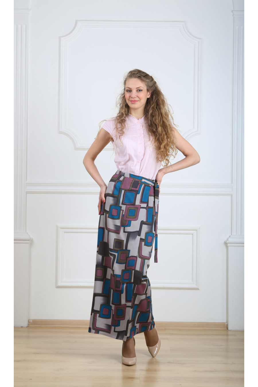 Юбка на средней посадке длинная на запах с поясом. Геометрия,бирюзово-розовая