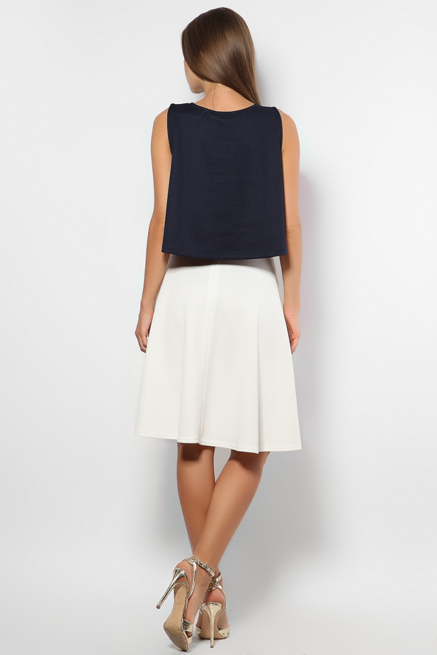 Распашенная нейлоновая блуза без рукавов в сочетании с юбкой-солнцем придают ощущение легкости и комфорта.