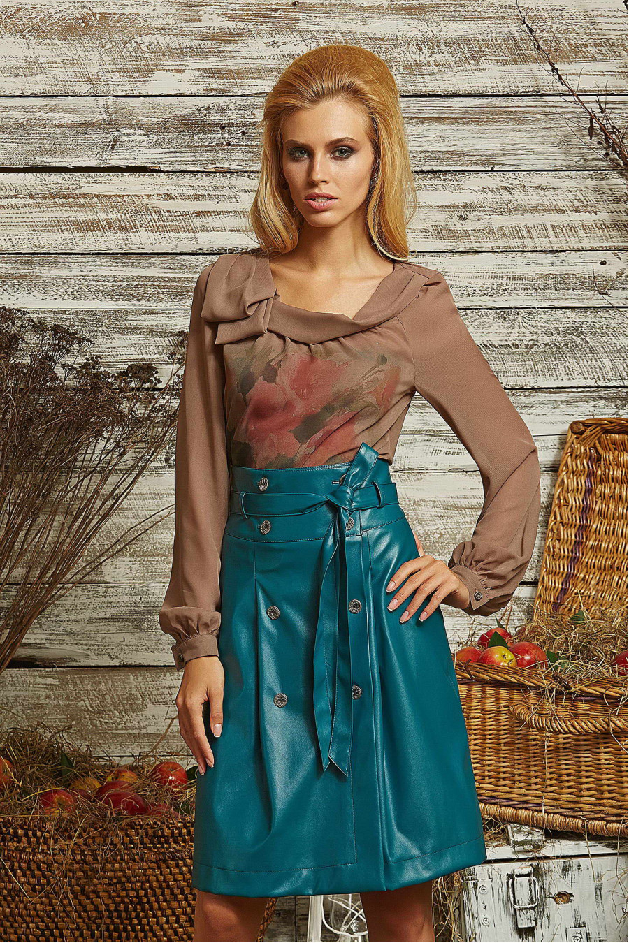 Эффектная юбка на запах, выполнена из искусственной кожи трапециевидного силуэта. По переду изделие застёгивается на пуговицы. На переднем полотнище заложены две встречные складки, декорированные пуговицами. По переду располагается цветная печать. Модель с завышенной талией, длина до середины колена. Дополнение служит кожаный пояс, который подчеркнёт Вашу талию. Изделие на подкладке. (Блуза артикул M2212T5002).