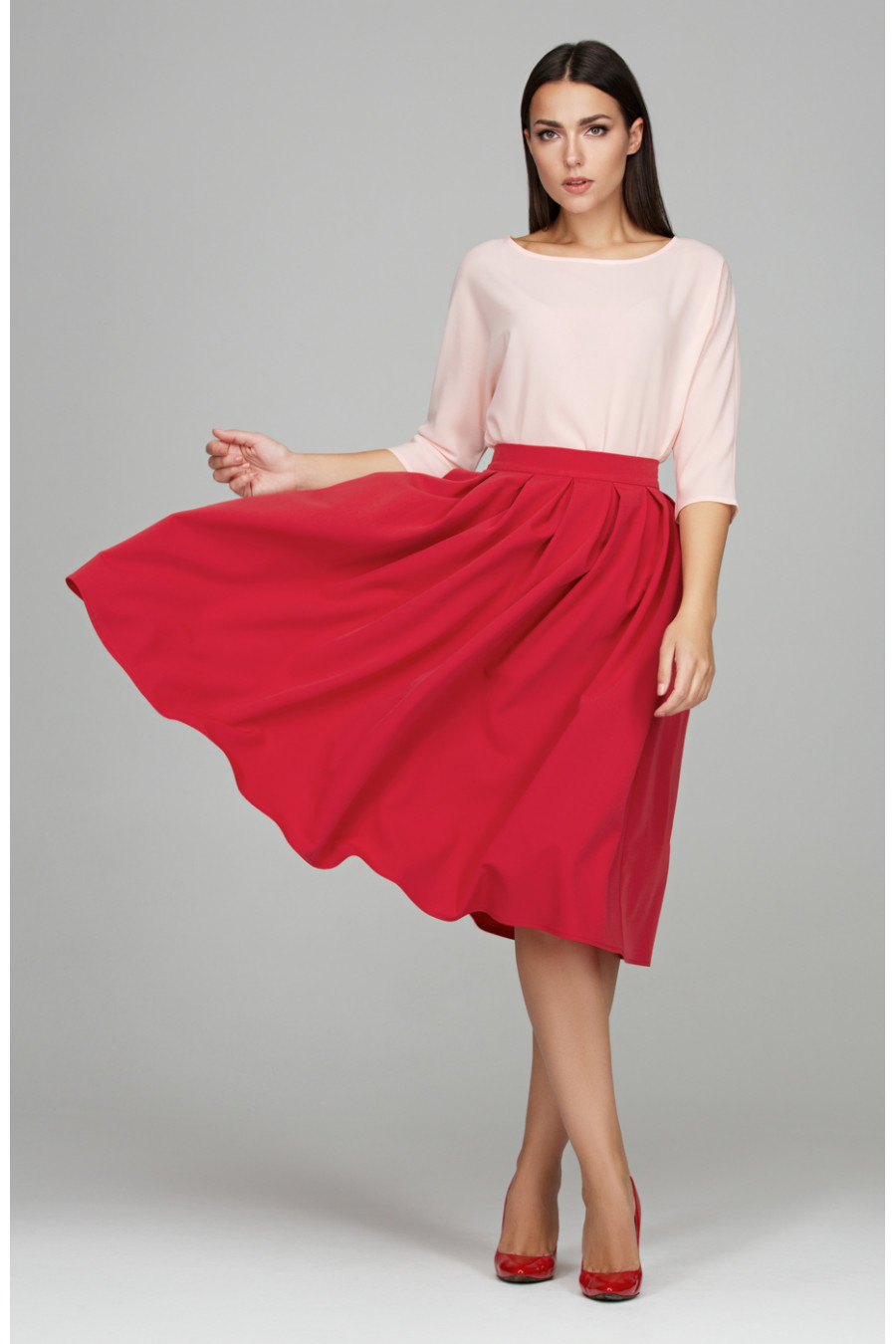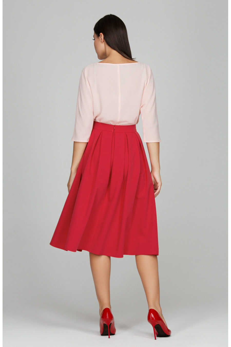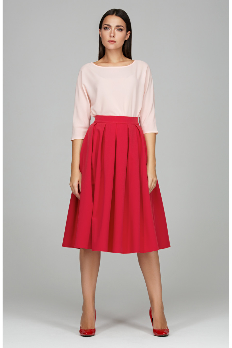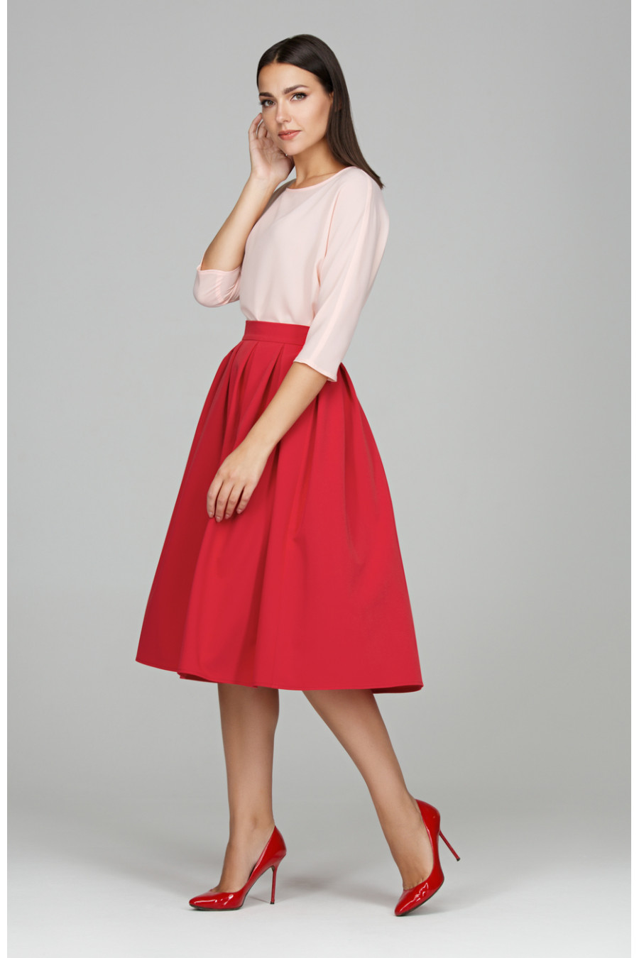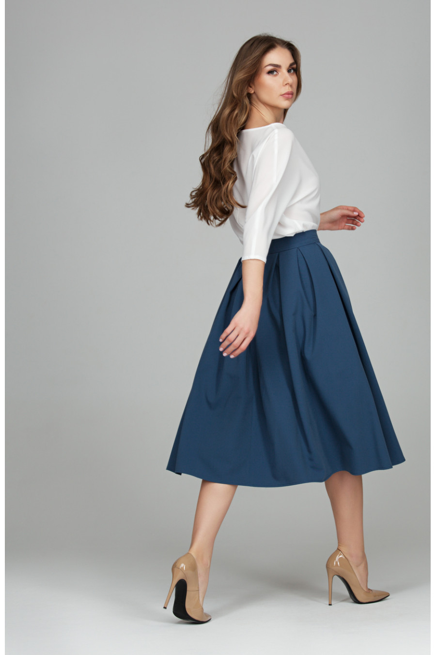 Юбка в складку длинной «за колено». Юбка выполнена из ткани «гальяно». Особый крой юбки с глубокими складками создает силуэт в стиле New Look, напоминающий перевернутый цветок. Верхний край обработан поясом. На заднем полотнище средний шов и застежка на потайную молнию.