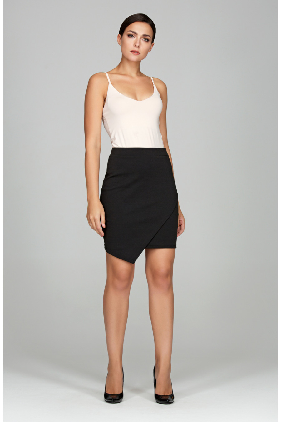 Юбка длинной «мини» на естественной линии талии, что позволяет визуально удлинить нижнюю часть фигуры, а именно ноги. Юбка обработана поясом с резинкой. Модель выполнена из трикотажа «джерси». Переднее полотнище ассиметричное с имитацией запаха.