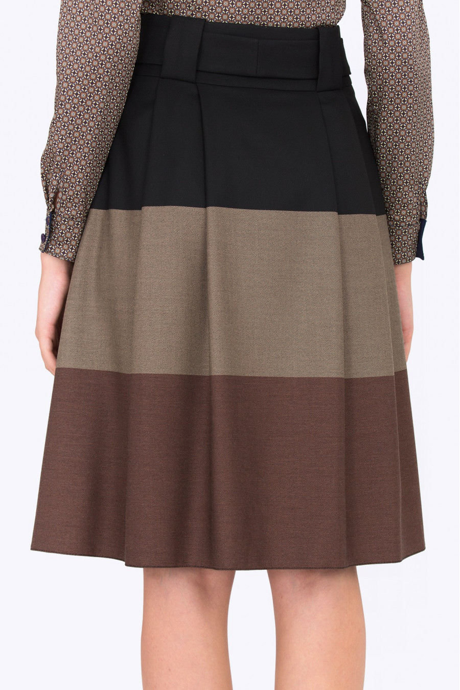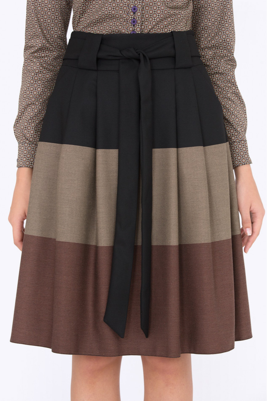 Расклешенная юбка с мягкими складками. Ткань гладкая, с эффектом эластичности в черную, серую и коричневую полоску. На поясе есть крупные шлевки, в комплект входит аккуратный тканевый пояс. По бокам удобные кармашки. Есть подкладка из полиэстера. Очень комфортная модель, хорошо подойдет для повседневной носки. Длина градируется от размера к размеру. Рост фотомодели 177 см. Длина: 62 см.