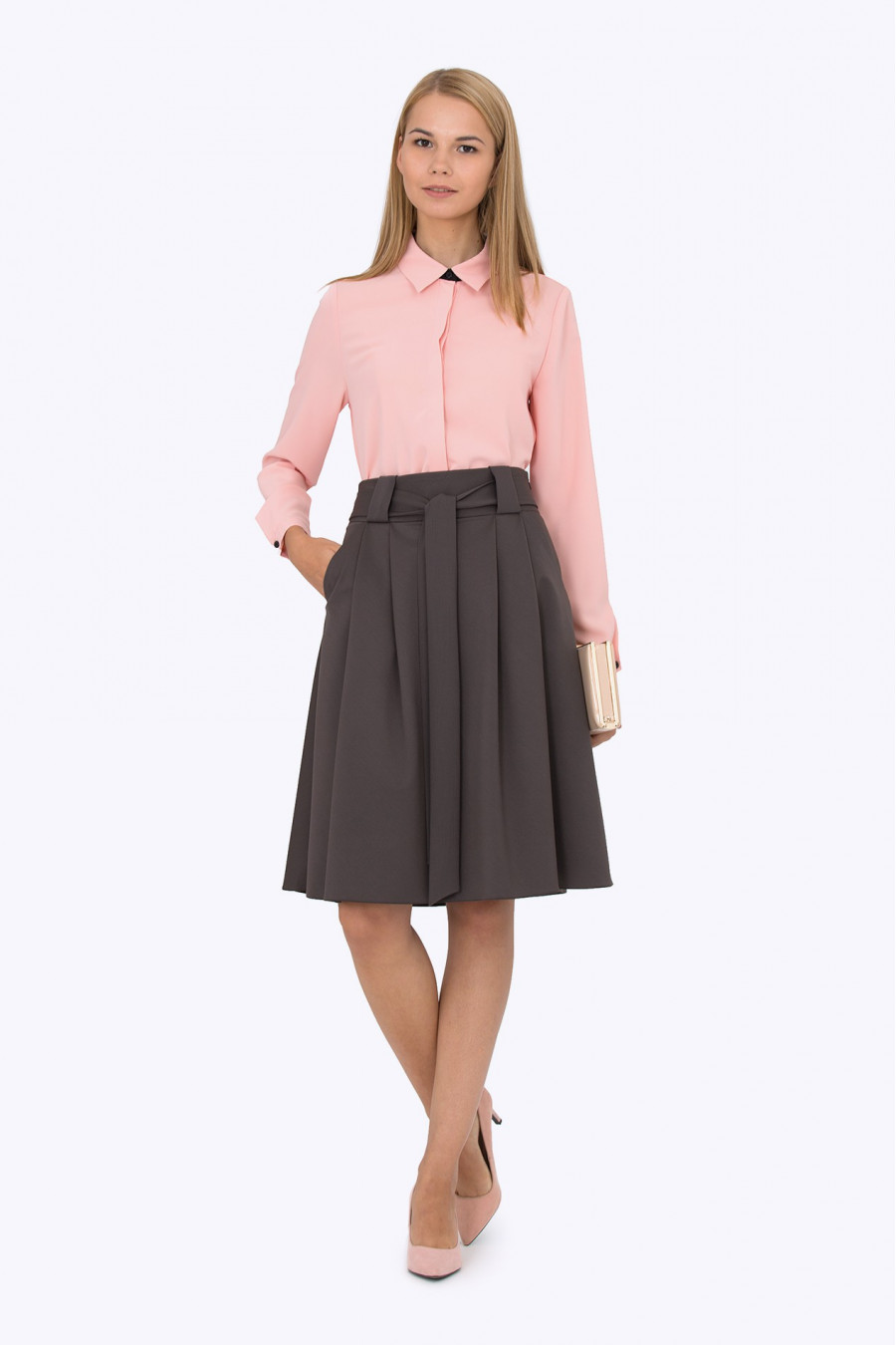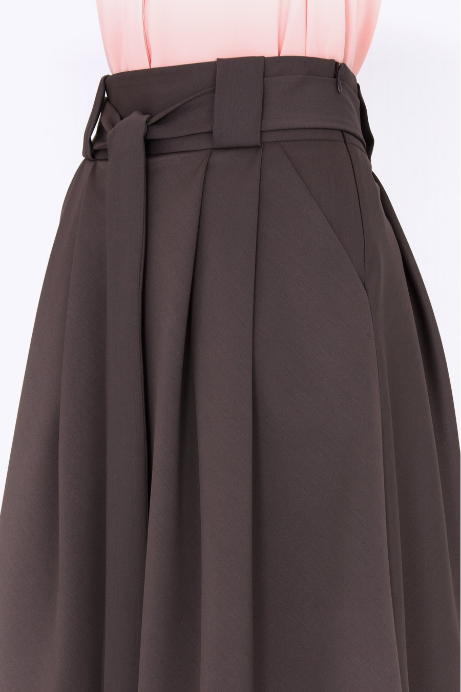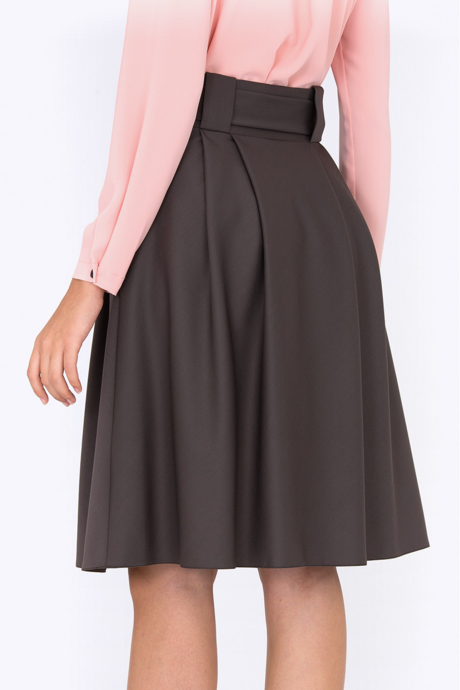 Расклешенная юбка с мягкими складками. Ткань гладкая, с эффектом эластичности цвета какао. На поясе есть крупные шлевки, в комплект входит аккуратный тканевый пояс. По бокам удобные кармашки. Есть подкладка из полиэстера. Очень комфортная модель, хорошо подойдет для повседневной носки. Длина градируется от размера к размеру. Рост фотомодели 177 см. Длина: 63 см.