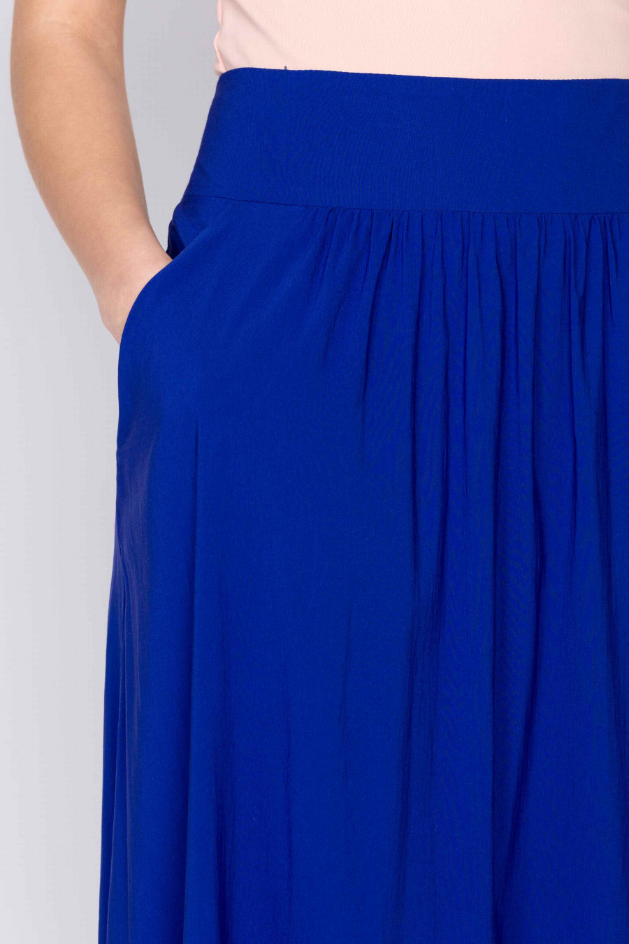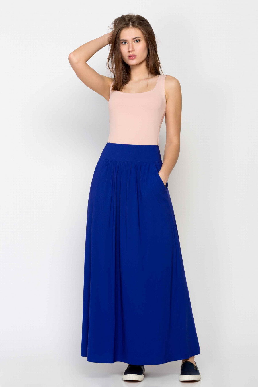 Легкая юбка в пол. Ткань струящаяся, мягкая с эффектом эластичности цвета электрик. Юбка на поясе, по бокам удобные функциональные кармашки, сзади застежка-молния. Без подкладки. Очень комфортная модель, хорошо подойдет для создания стильного образа.