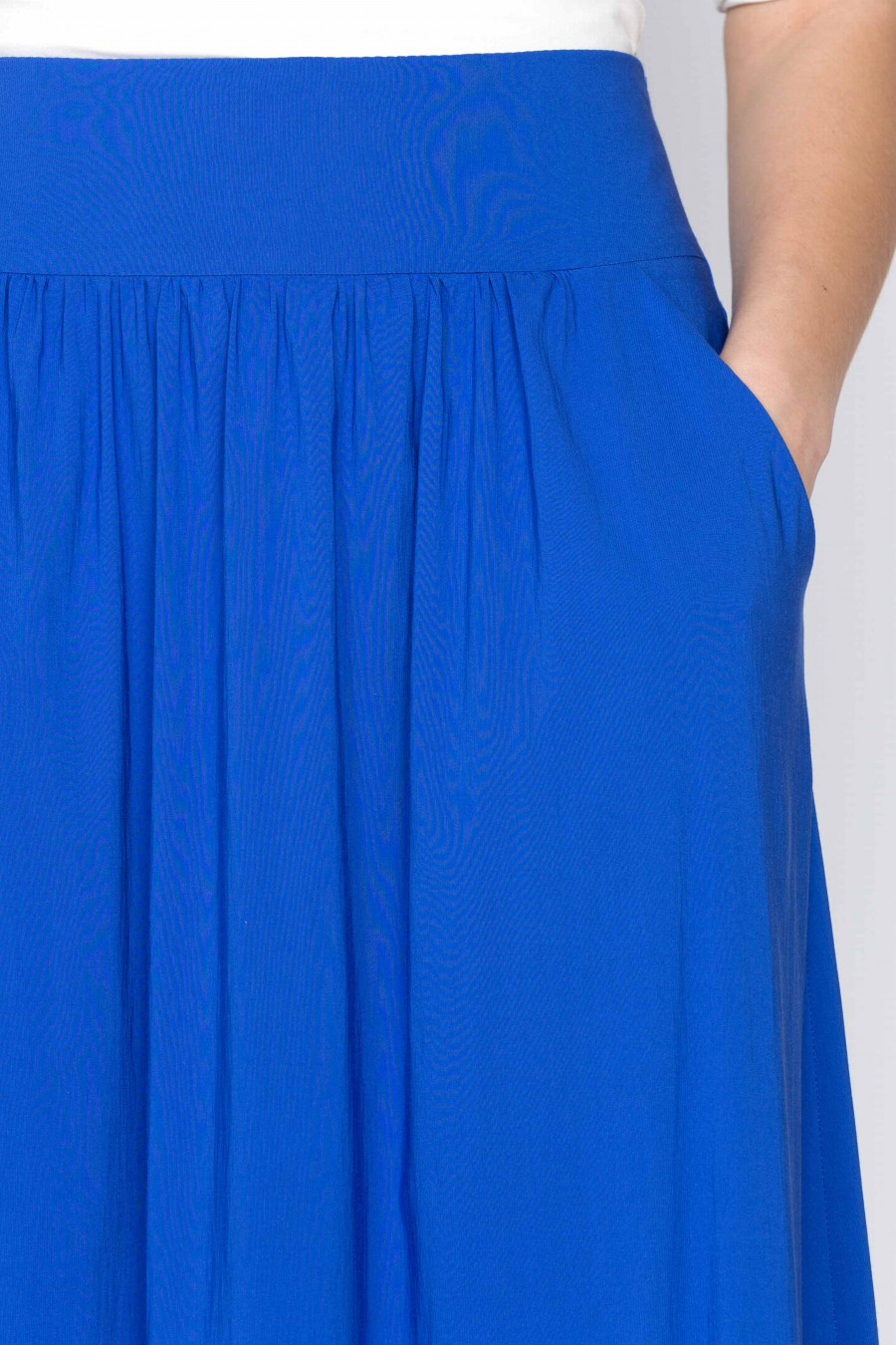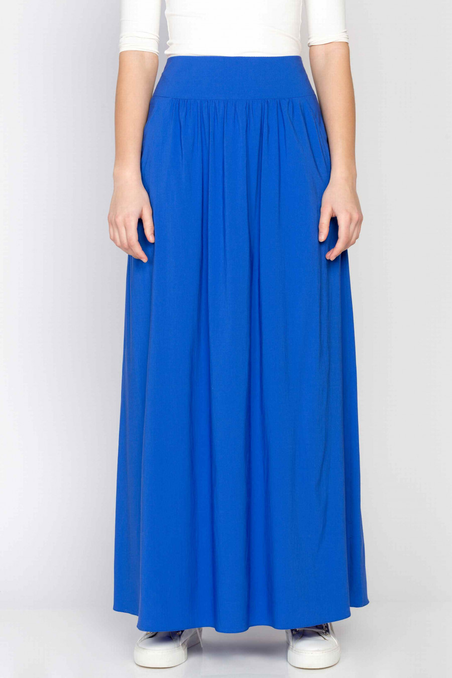 Легкая юбка в пол. Ткань струящаяся, мягкая с эффектом эластичности синего цвета. Юбка на поясе, по бокам удобные функциональные кармашки, сзади застежка-молния. Без подкладки. Очень комфортная модель, хорошо подойдет для создания стильного образа.