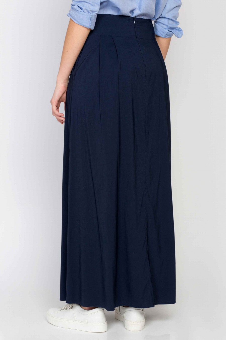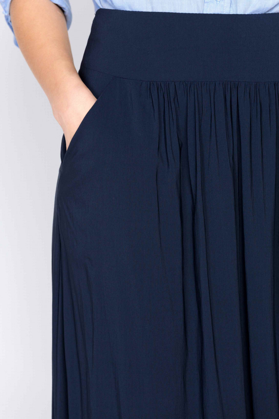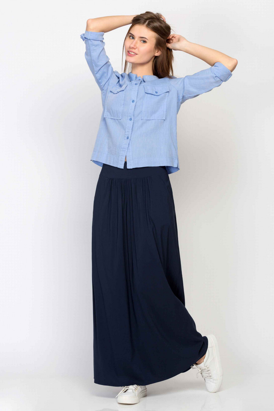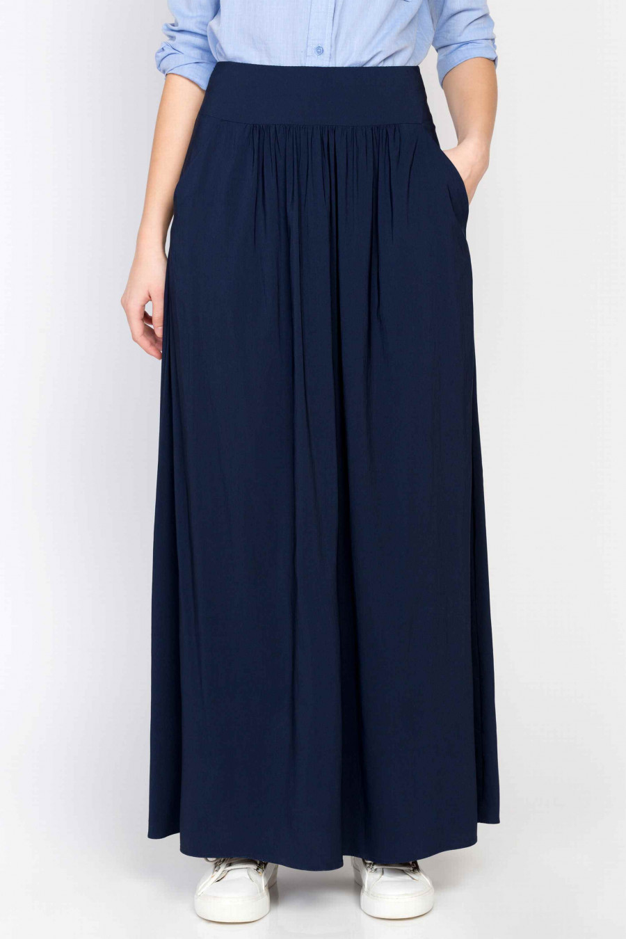 Легкая юбка в пол. Ткань струящаяся, мягкая с эффектом эластичности темно-синего цвета . Юбка на поясе, по бокам удобные функциональные кармашки, сзади застежка-молния. Без подкладки. Очень комфортная модель, хорошо подойдет для создания стильного образа.