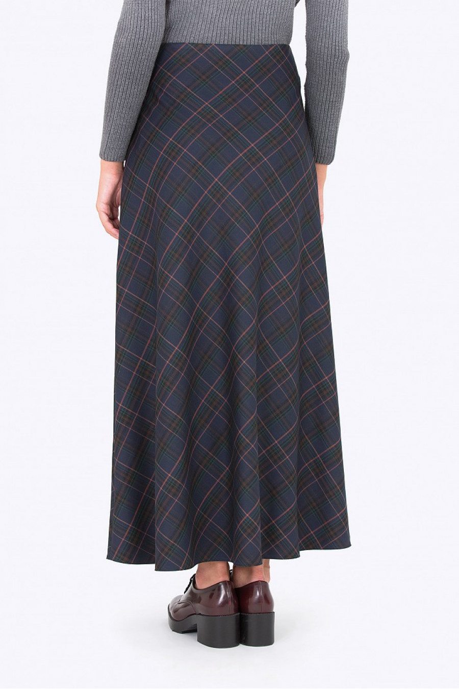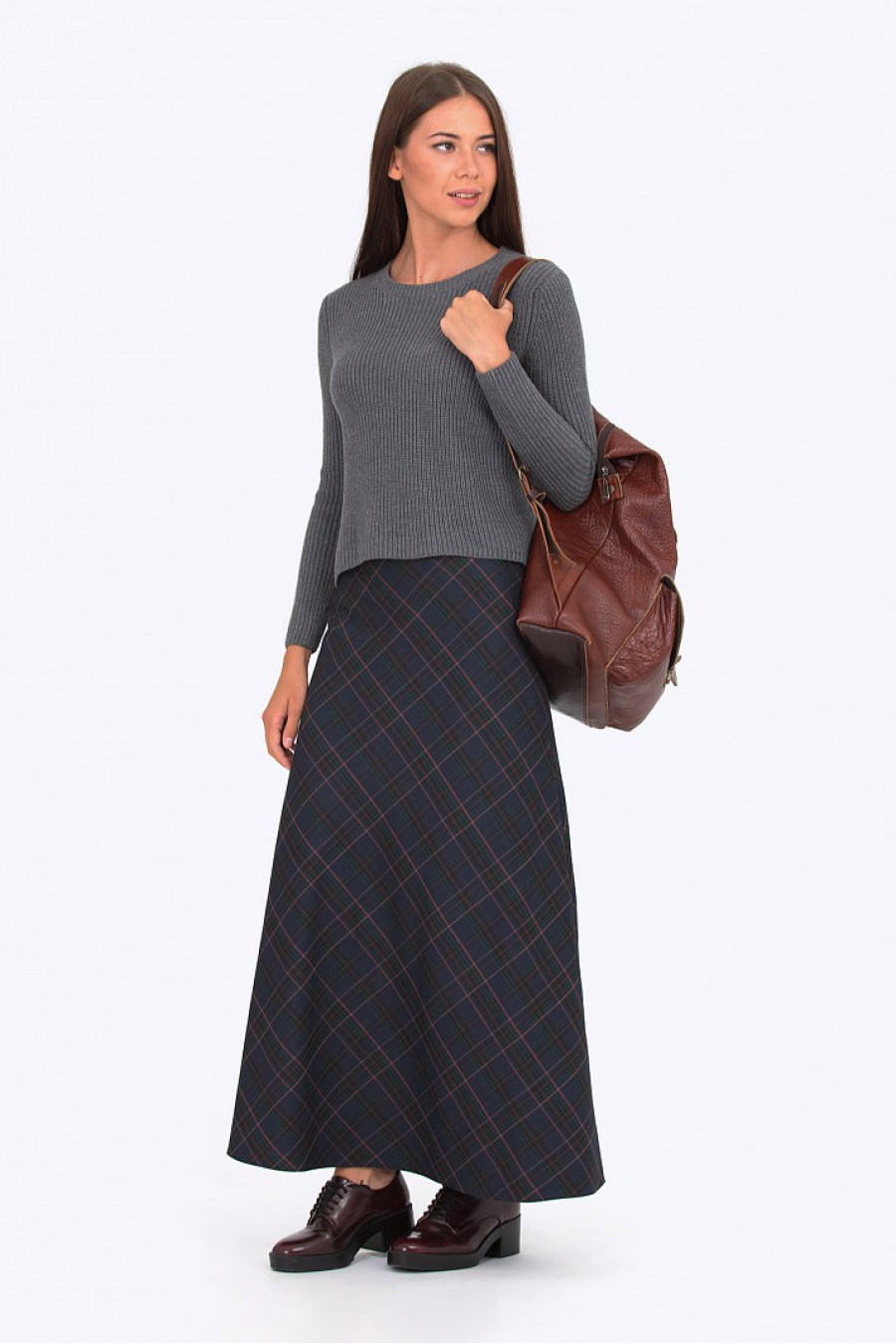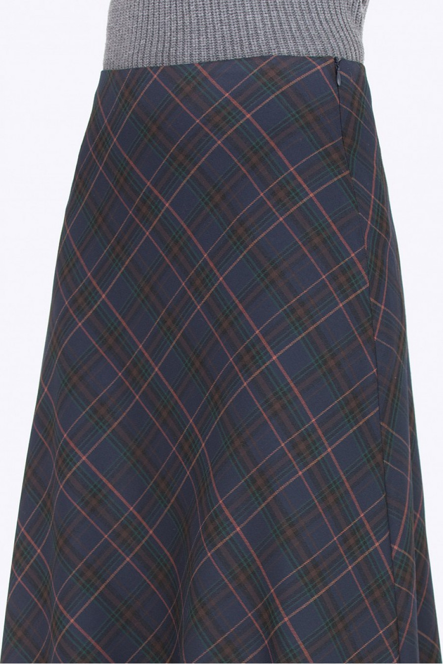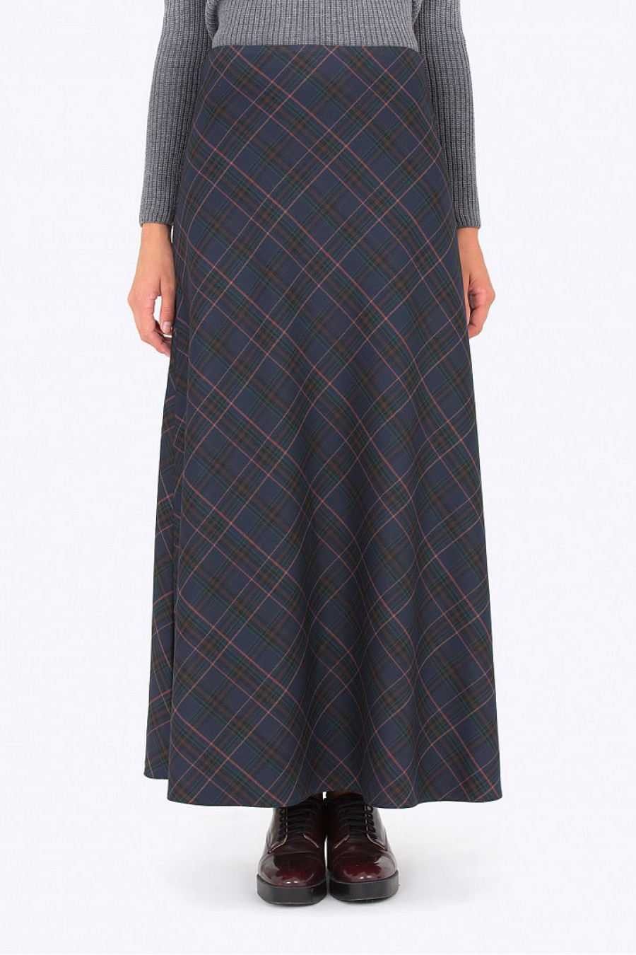 Элегантная юбка-трапеция. Ткань темно-синего цвета в коричневую и зеленую полоску, приятная на ощупь. Есть плотная подкладка из полиэстера. Сбоку застежка-молния. Юбка хорошо сидит по фигуре, зрительно удлиняет силуэт, поможет создать женственный, притягательный образ.