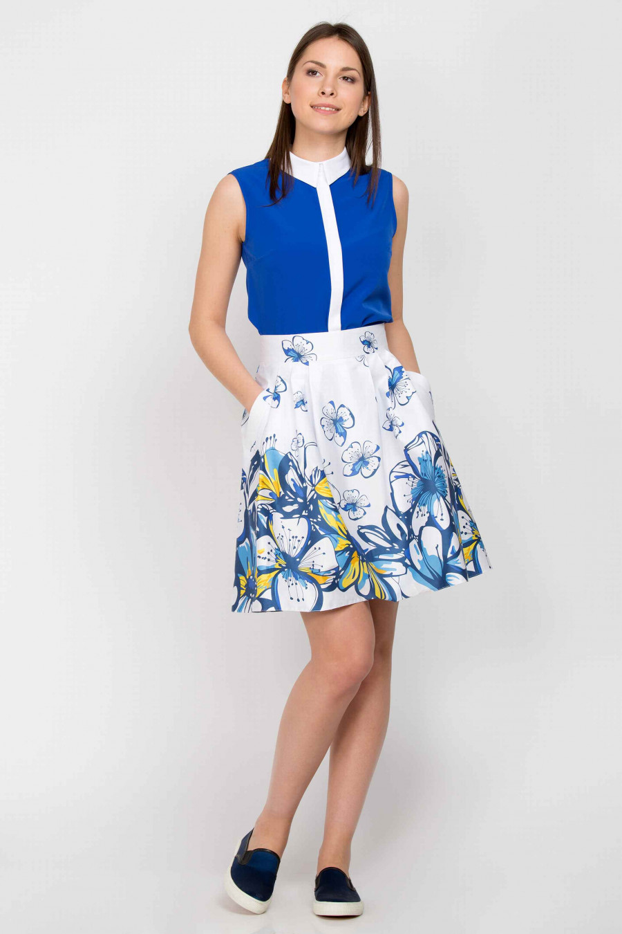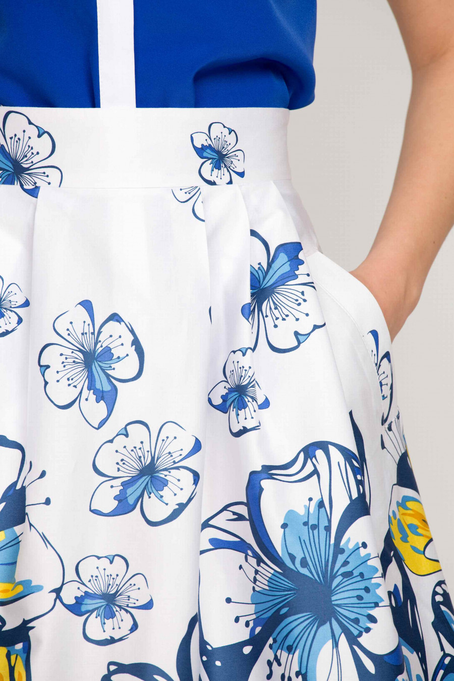 Легкая расклешенная юбка на поясе. Ткань - натуральный хлопок, белая с нежным цветочным принтом. Без подкладки. По бокам аккуратные функциональные кармашки. Застежка-молния сбоку. Юбка хорошо держит форму, подчеркивает линию талии, подойдет для весенне-летнего сезона. Отличная модель для создания нежного образа.