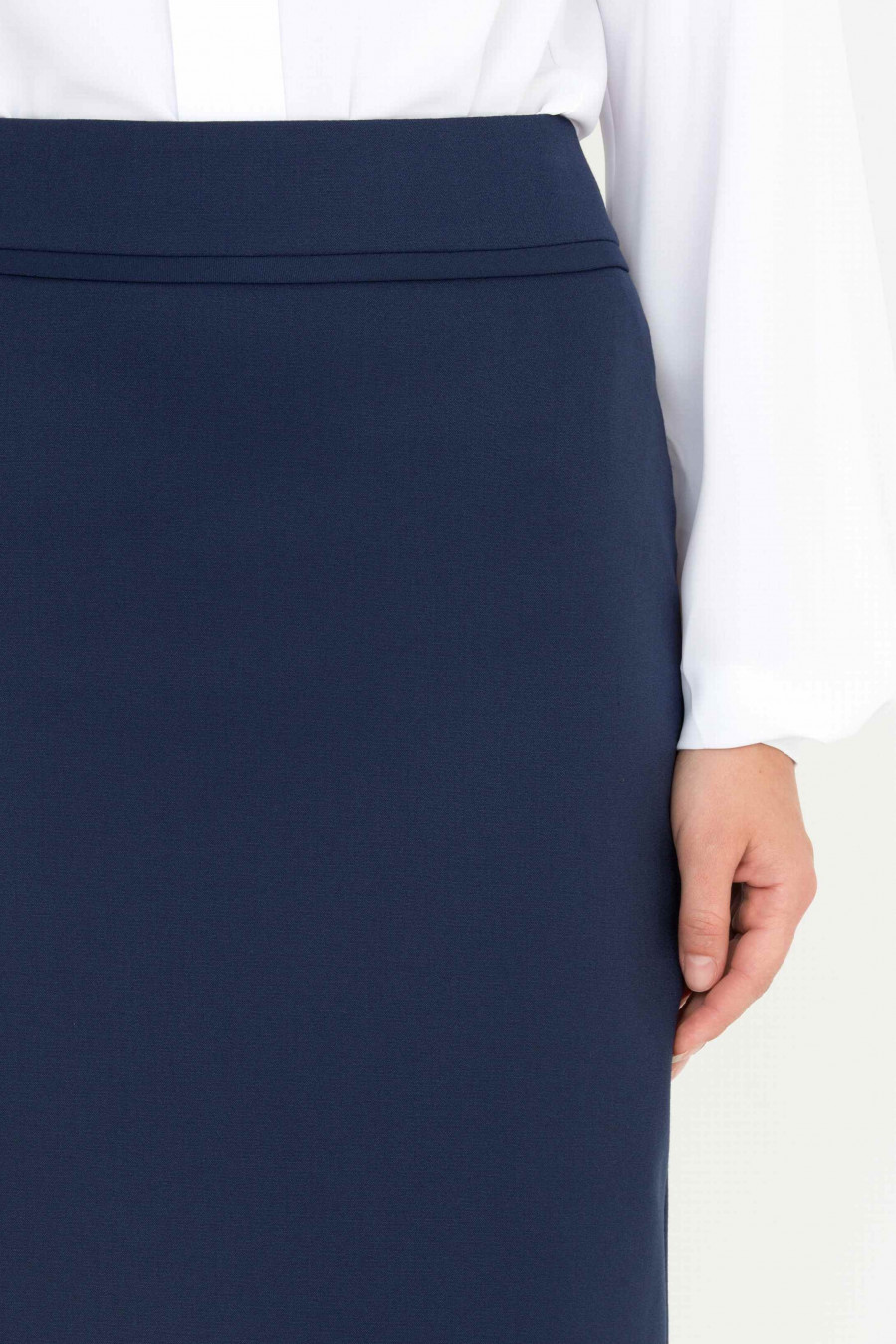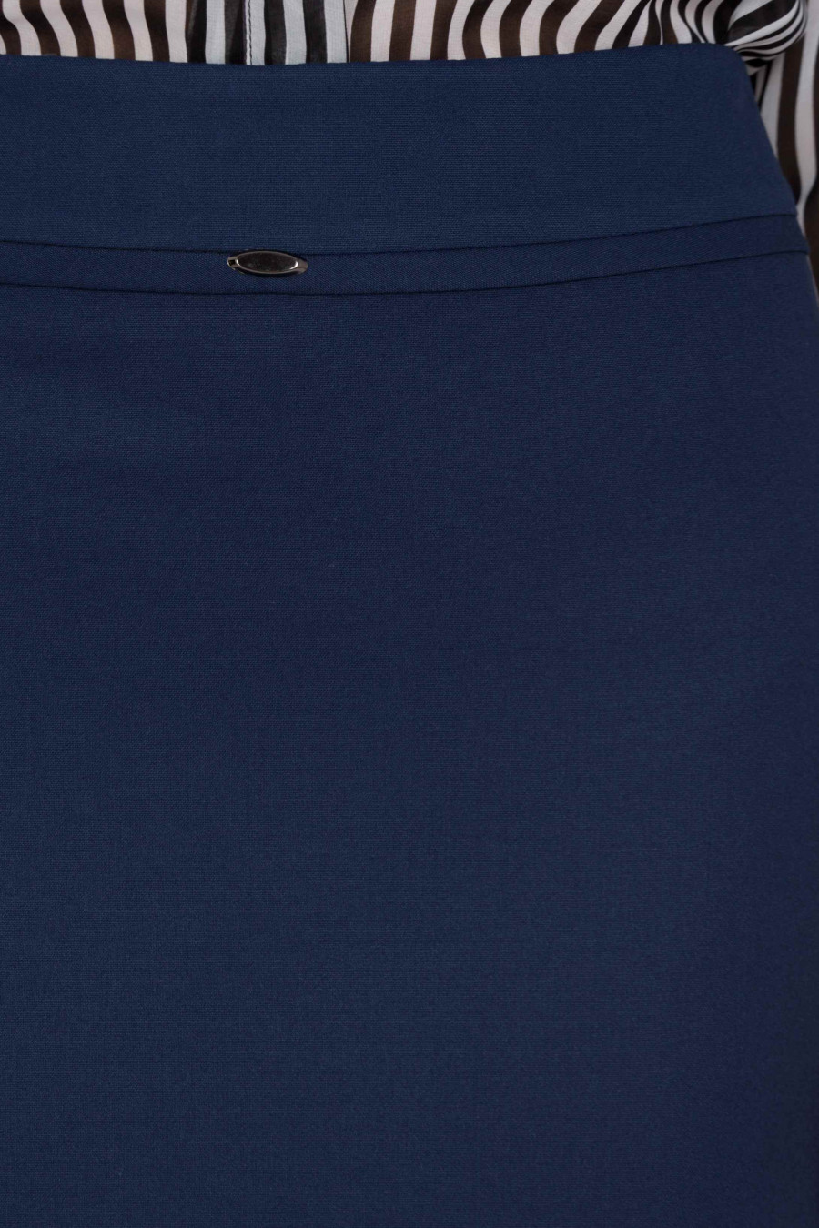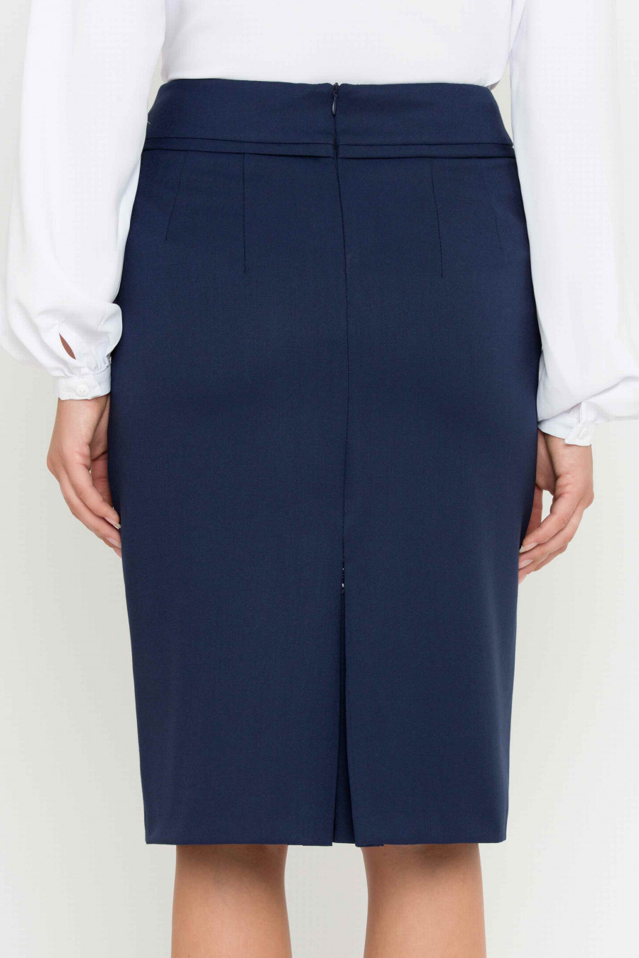 Классическая темно-синяя юбка-карандаш на поясе. Ткань эластичная, приятная на ощупь. Есть подкладка из полиэстера. Сзади застежка-молния. Особого внимания заслуживает разрез юбки - он оформлен оригинальными складками и тремя декоративными пуговицами. Отличная модель для офиса. Хорошо сочетается со светлыми блузками и рубашками.