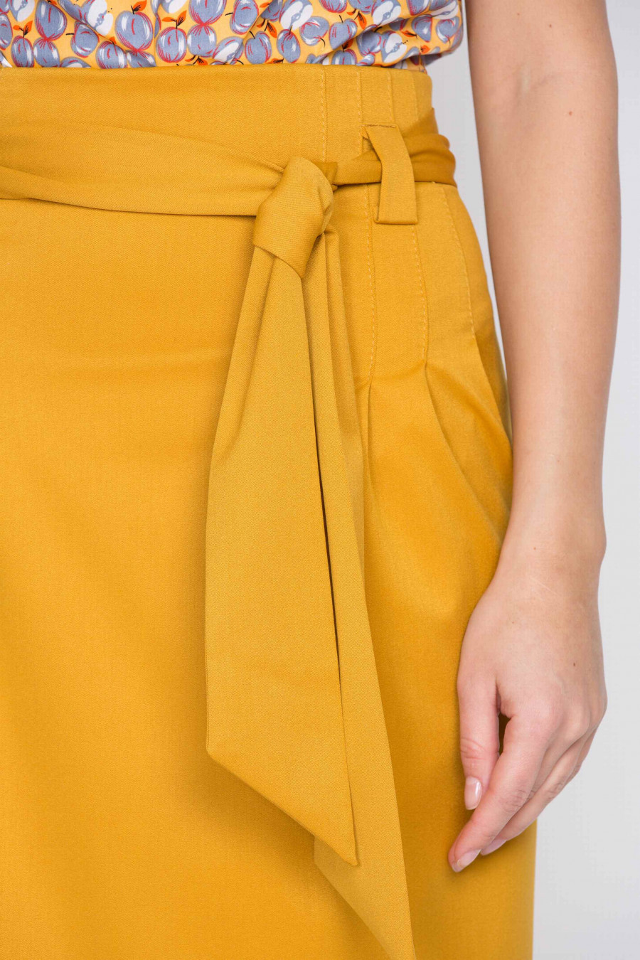 Классическая юбка с мягкими застроченными складками. Ткань с эффектом эластичности яркого горчичного цвета. По бокам есть удобные функциональные кармашки. На поясе шлевки, в комплект входит элегантный тканевый пояс. Есть подкладка из полиэстера. Отличная модель на повседневную носку, хорошо сидит по фигуре.