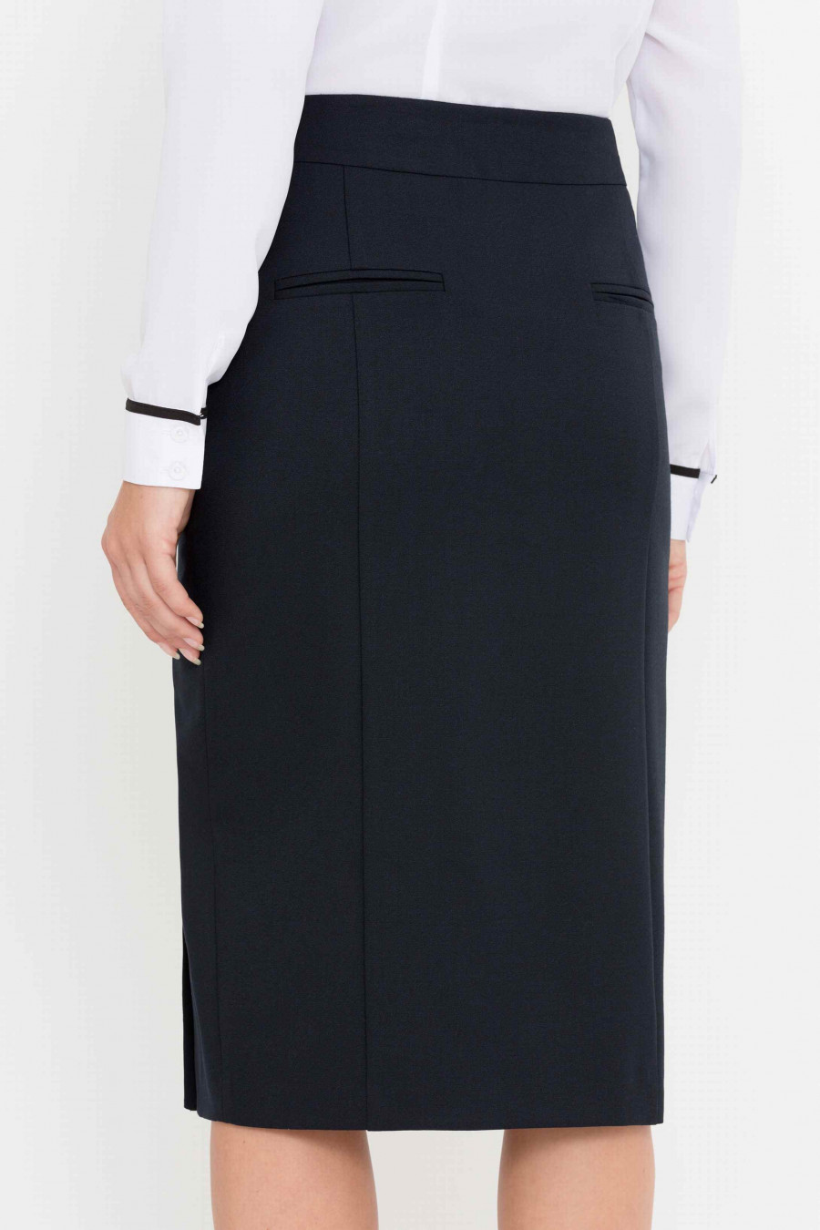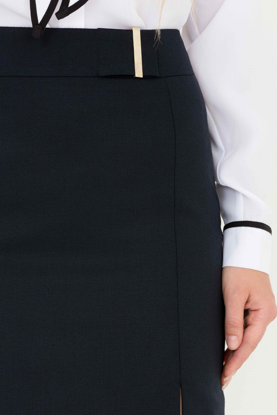 Элегантная темно-синяя юбка с эффектным боковым разрезом. Ткань гладкая, слегка эластичная, есть подкладка из полиэстера. Пояс оформлен декоративной пряжкой. Юбка хорошо сидит по фигуре, скрывает недостатки и подчеркивает достоинства. Отличная модель на повседневную носку. Образ на фотографии дополняет блузка b 2135-darina.
