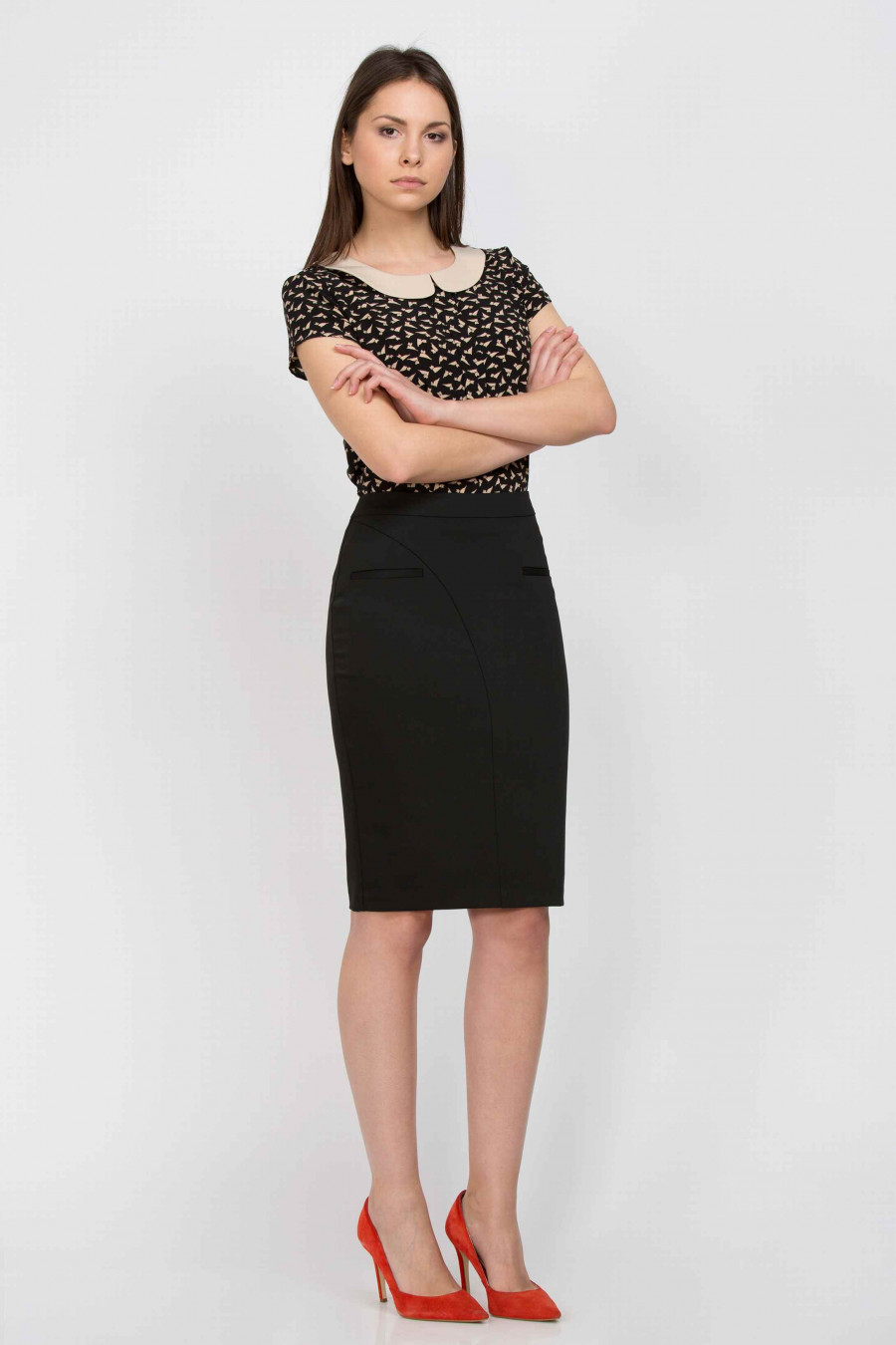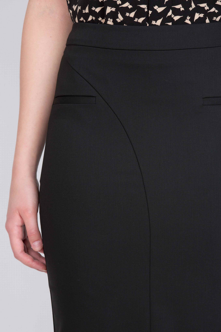 Элегантная юбка-карандаш из гладкой черной ткани. Спереди юбка оформлена асимметричным рельефом и аккуратными карманами-обманками. Сзади - шлица и застежка-молния. Есть подкладка из полиэстера. Хорошая базовая модель. Отлично подойдет для офиса.
