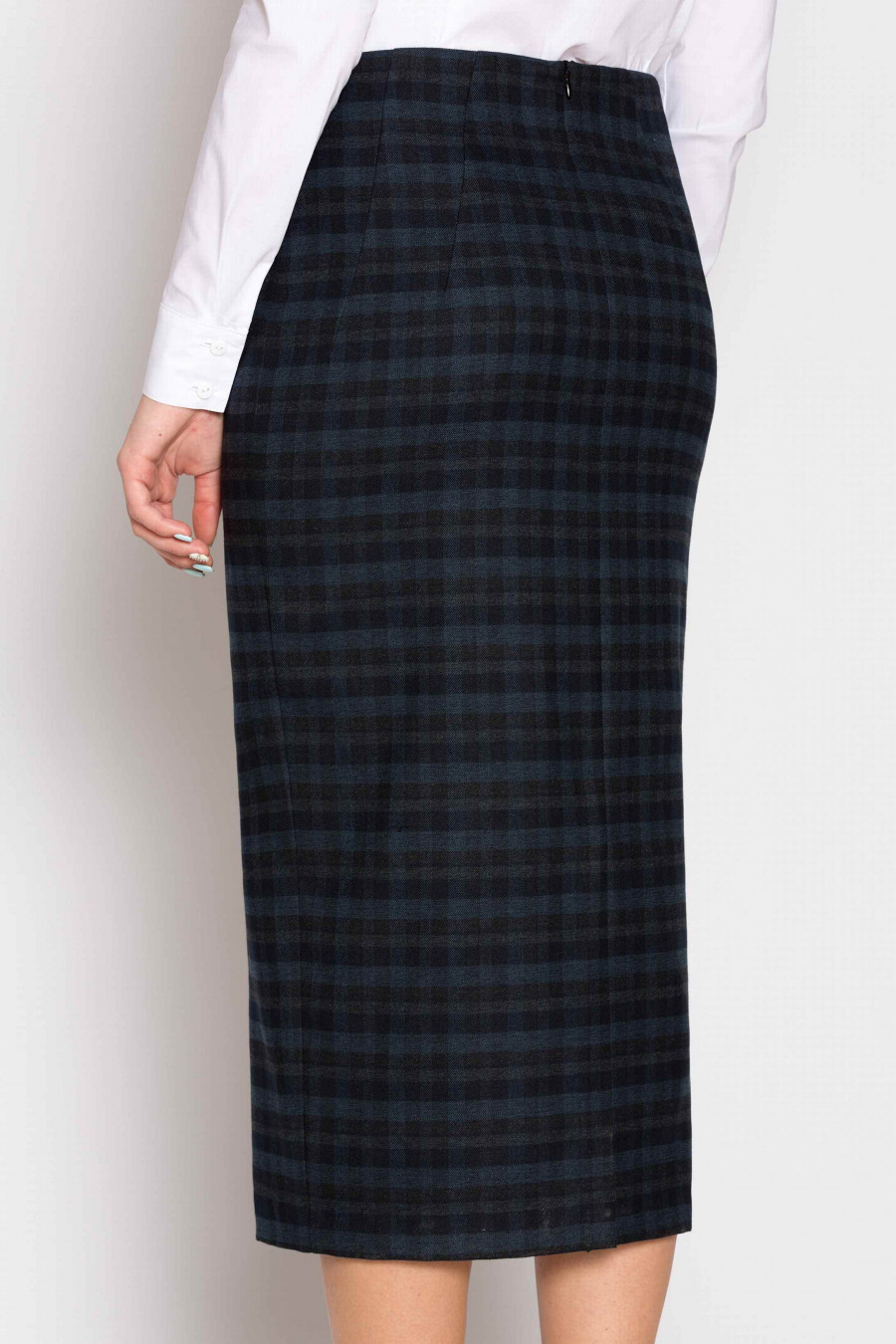 Облегающая юбка-миди из мягкой ткани в темно-синюю клетку. Сзади застежка-молния и элегантная шлица. Есть подкладка из полиэстера. Юбка идеально сидит по фигуре, визуально вытягивает силуэт и стройнит. Отличный вариант для офиса.